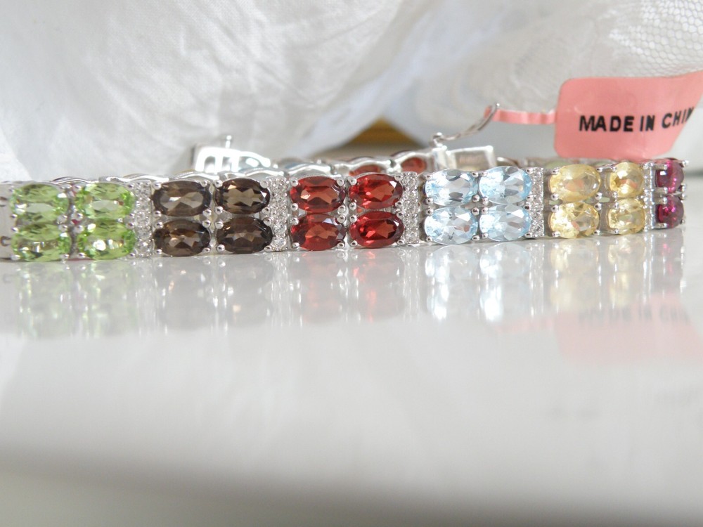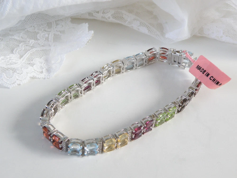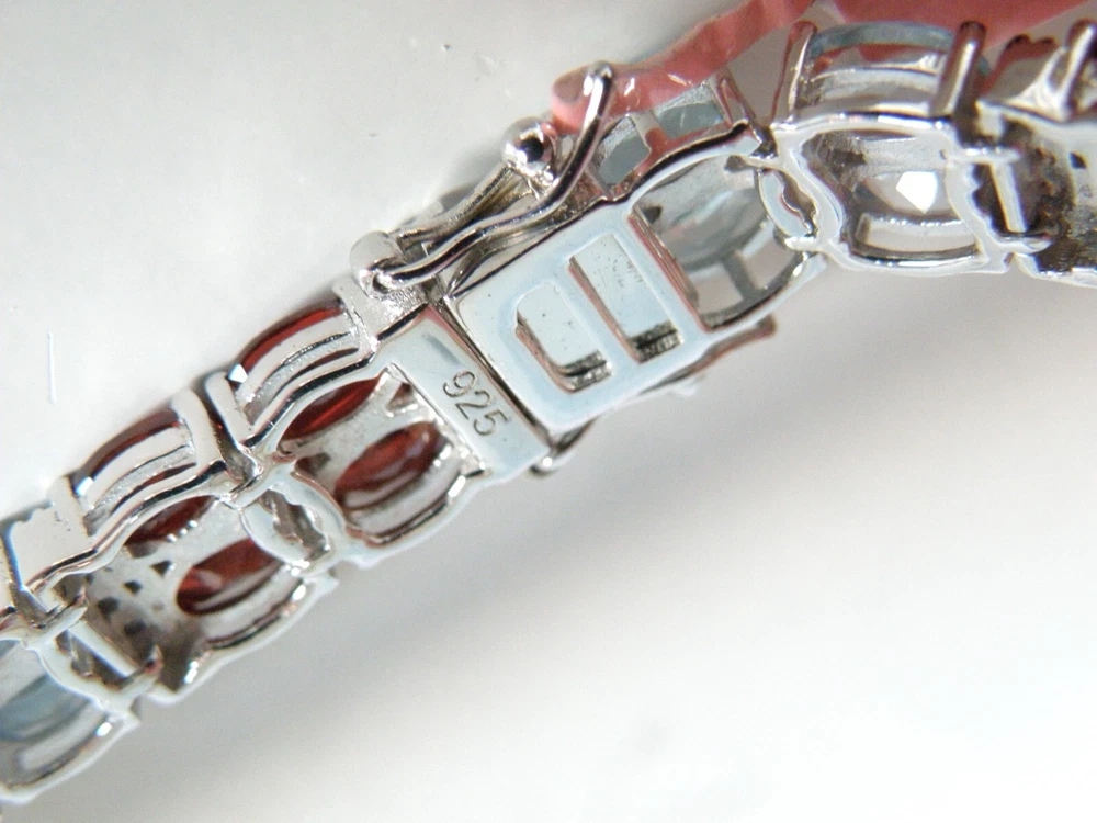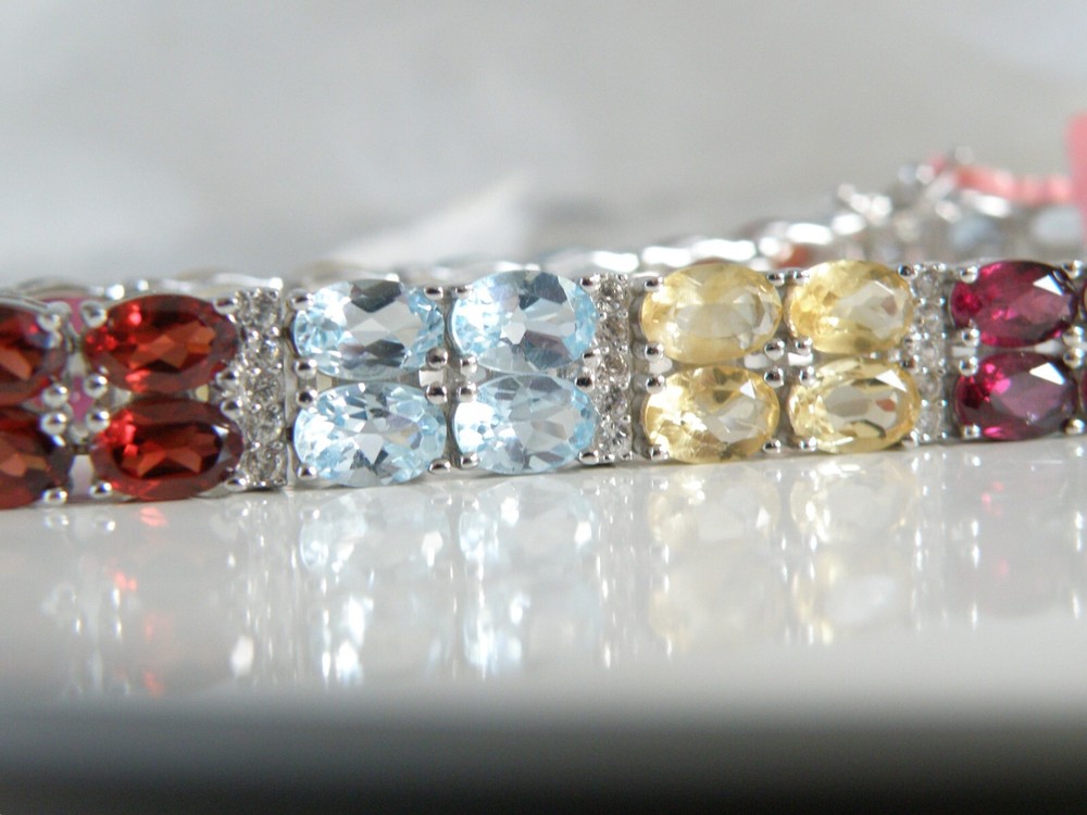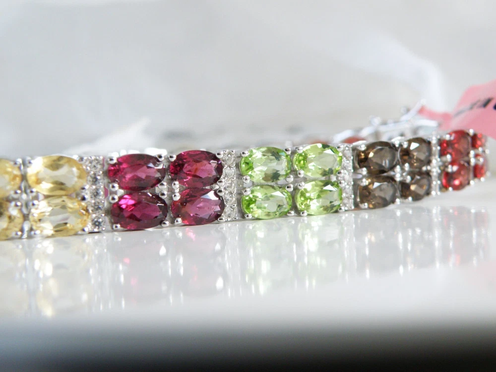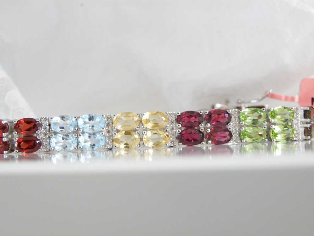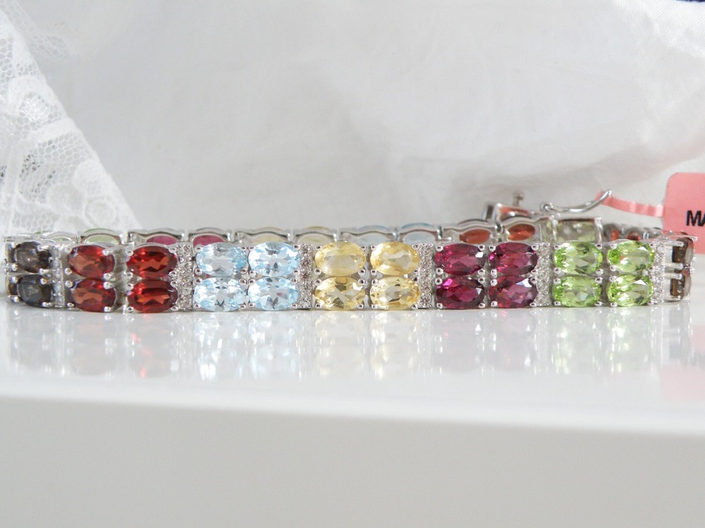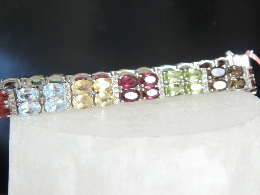 A double row of romantic and dreamy gemstones in this fantastic sterling silver tennis bracelet. White topaz small accents separate each section in groups of 4 gems. An oversized box clasp with double safety guard. New with tags. $489 retail. May have light tarnish from being stored. Marked 925 for sterling silver Measures approx 8.5" long end to end - 8-3/8" with the clasp closed x .35" wide Weight 24.9 grams - light weight