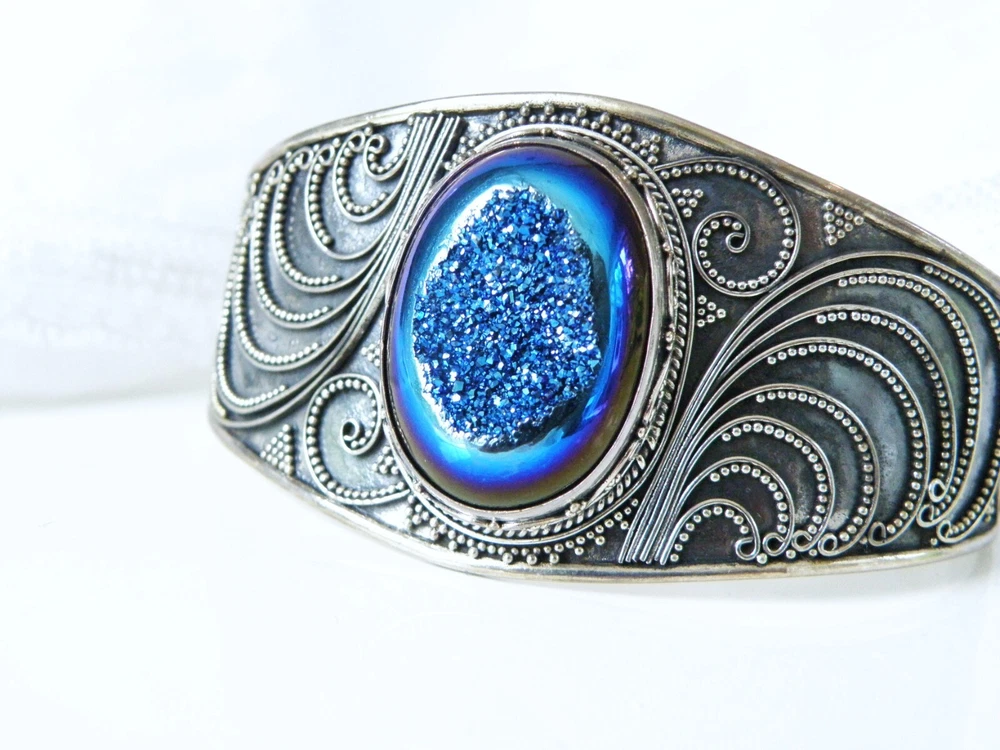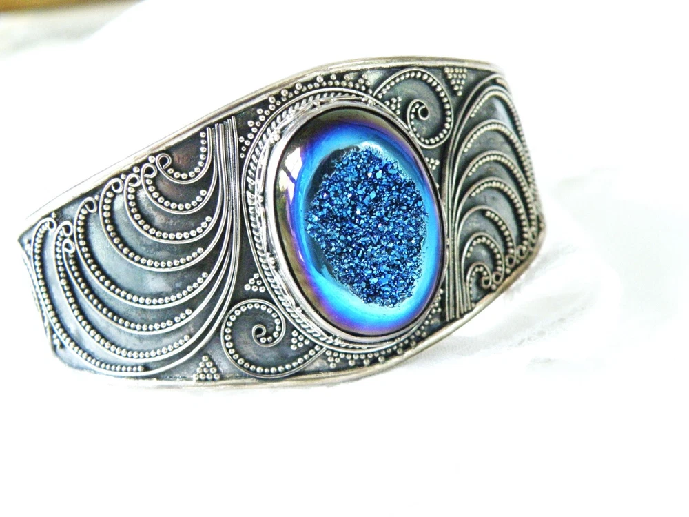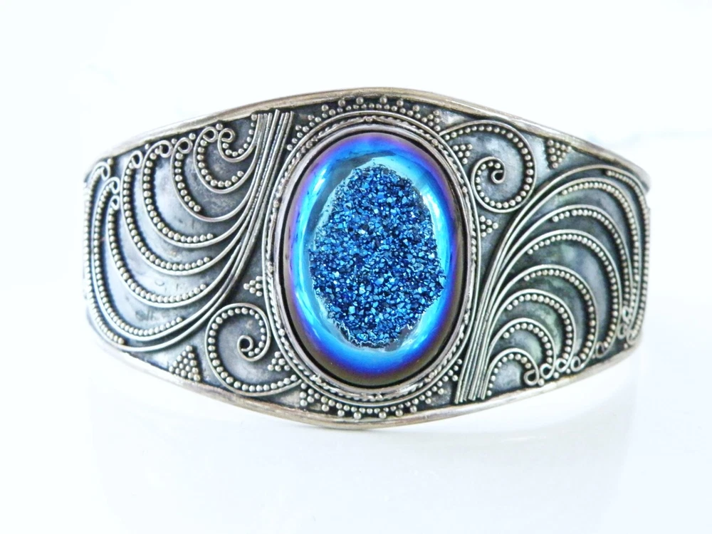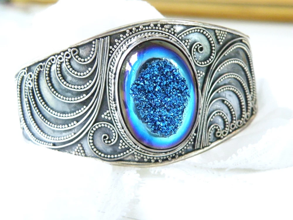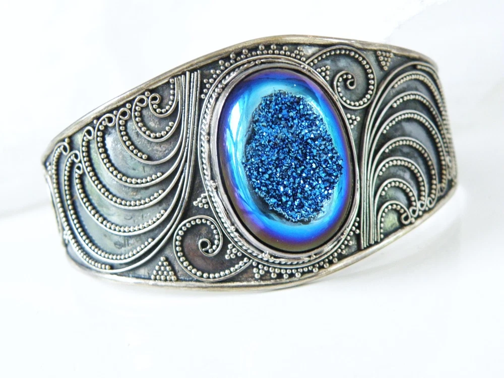 When it’s time to party, you need a fun bracelet, and this is it! This fabulous chunky sterling silver wrap cuff bracelet showcases a very slick design with an electric blue drusy crystal and beadwork that is meticulously placed. The gap opens to accommodate a size up or down. WEIGHT: 33.6 grams - nice weight MEASURES APPROX: 7.5" inside or 2- 1/2" across the top x 1.32" top to bottom of the widest area MARKINGS: '925' for sterling silver and there might be a maker's mark under the retail sticker