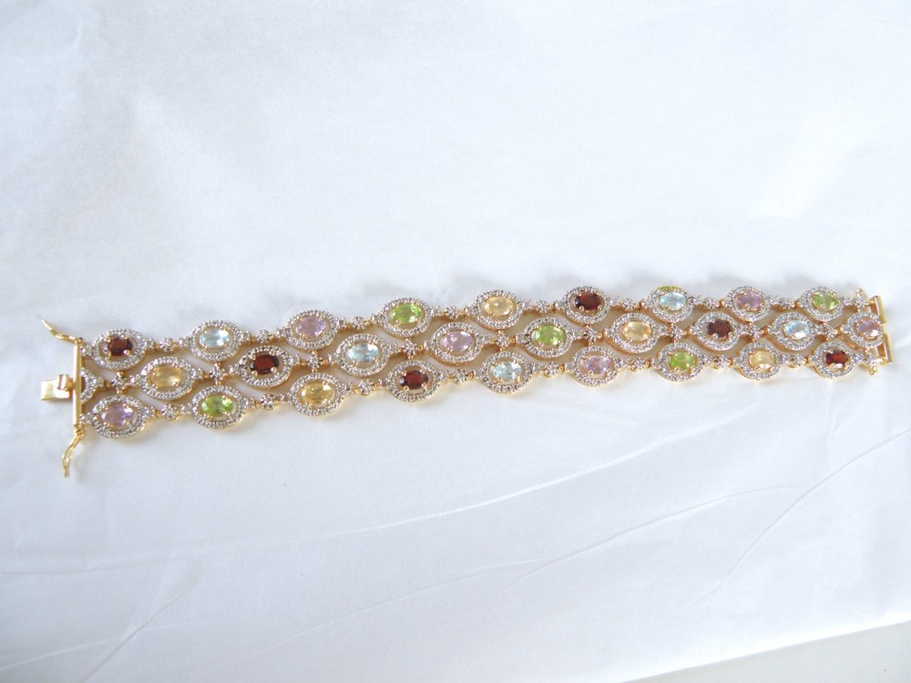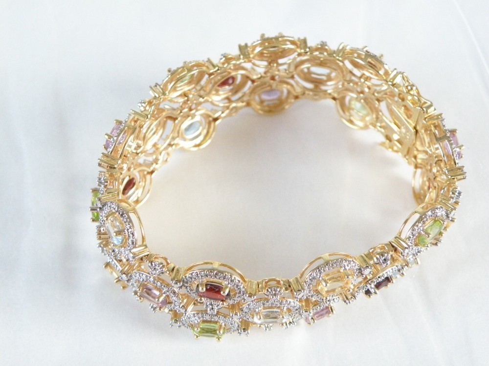 Liven up your jewelry wardrobe with this colorful alternative to a traditional tennis bracelet. Featuring a stunning signature piece with 3 rows of sparkling gemstones. A very well constructed tennis bracelet. A tight box clasp with a double safety guard. Composed of yellow gold over sterling silver. Weight 37.8 grams Measures approx. 7-1/2" long end to end. 7-1/4" with the clasp closed x .90" widest Stones measure approx. 6-mm-x 4-mm Marked 925 for sterling silver 'China R' for the maker's mark