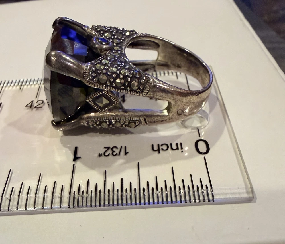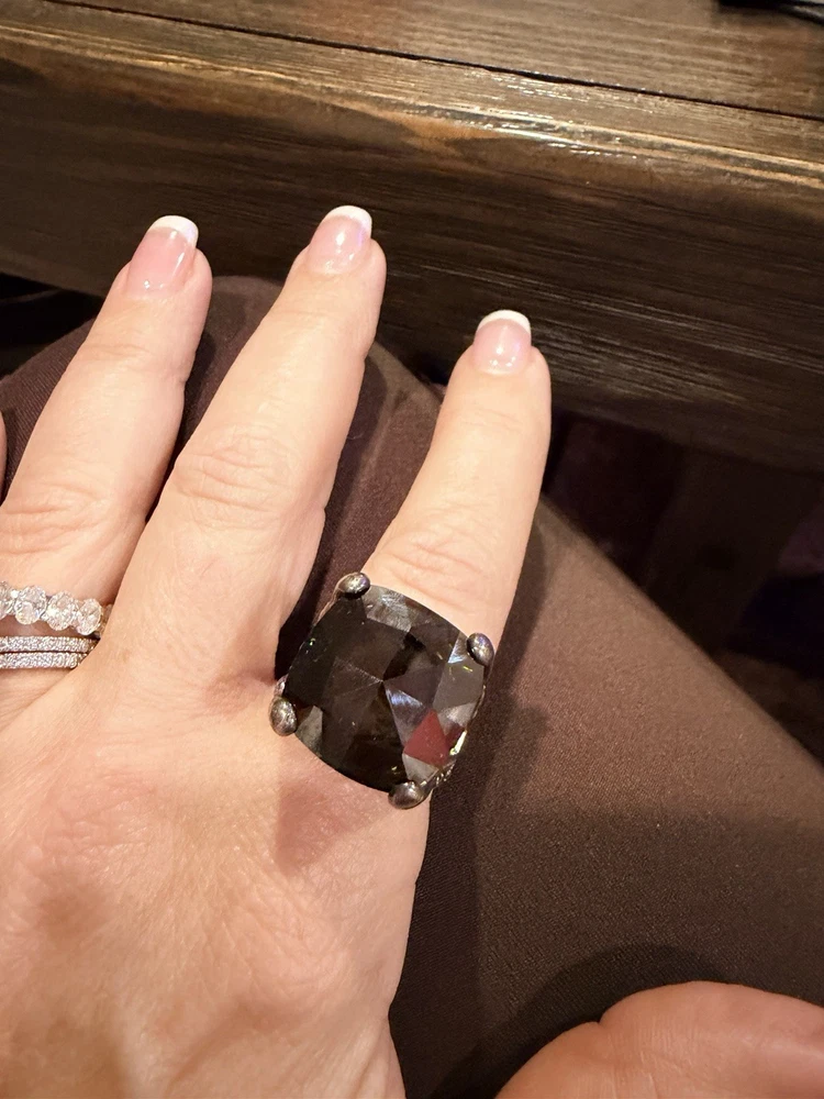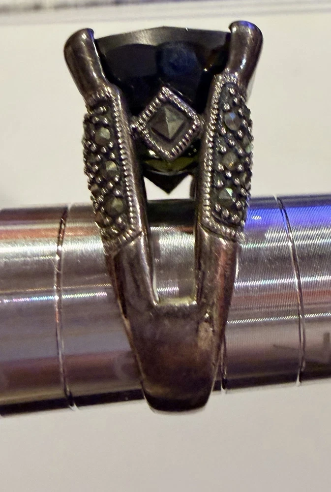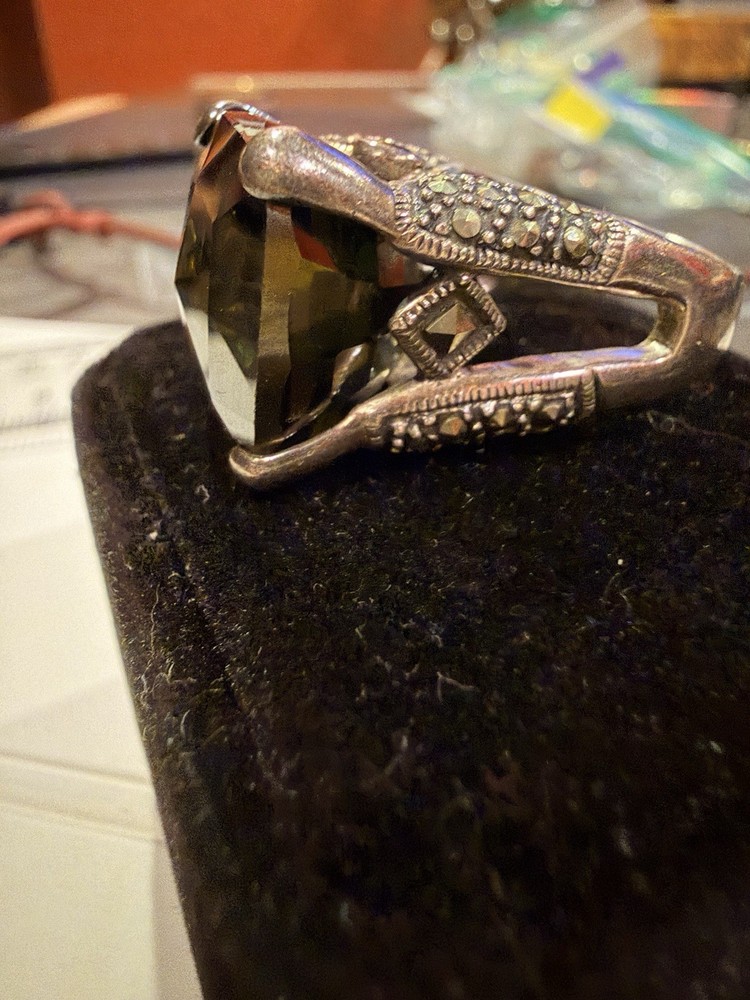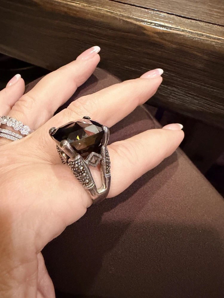 ✨ STUNNING STATEMENT RING ✨ Dramatic sterling silver cocktail ring featuring an absolutely gorgeous large cushion-cut smoky quartz centerpiece surrounded by intricate marcasite detailing in a vintage Art Deco inspired design. 💎 DETAILS: • Sterling silver (stamped 925) • Large smoky quartz center stone (est. 25-30+ carats) • Marcasite accents with decorative bow motif • Peridot or citrine accent stone detail • Elaborate openwork gallery & sides • Size approx. 7.5-8. See pictures • Substantial weight - quality piece 🖤 STYLE: Perfect for making a statement! This ring has serious presence with its large gemstone and vintage-inspired design. The smoky quartz has beautiful depth and the marcasite sparkle adds incredible dimension. Ideal for cocktail parties, special occasions, or elevating everyday style. 📸 CONDITION: Good pre-owned condition with typical silver tarnish in crevices (easily cleaned). All stones secure. #statementring #smokyquartz #marcasite #sterlingsilver #artdeco #vintagestyle #cocktailring #gemstone #gothic