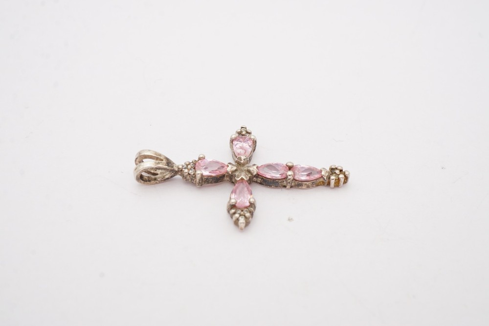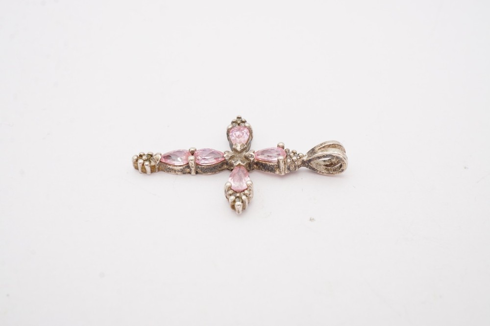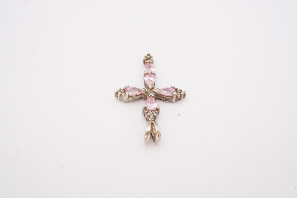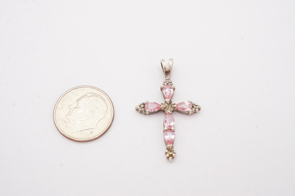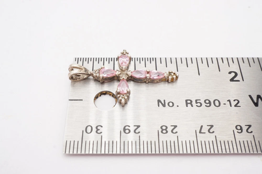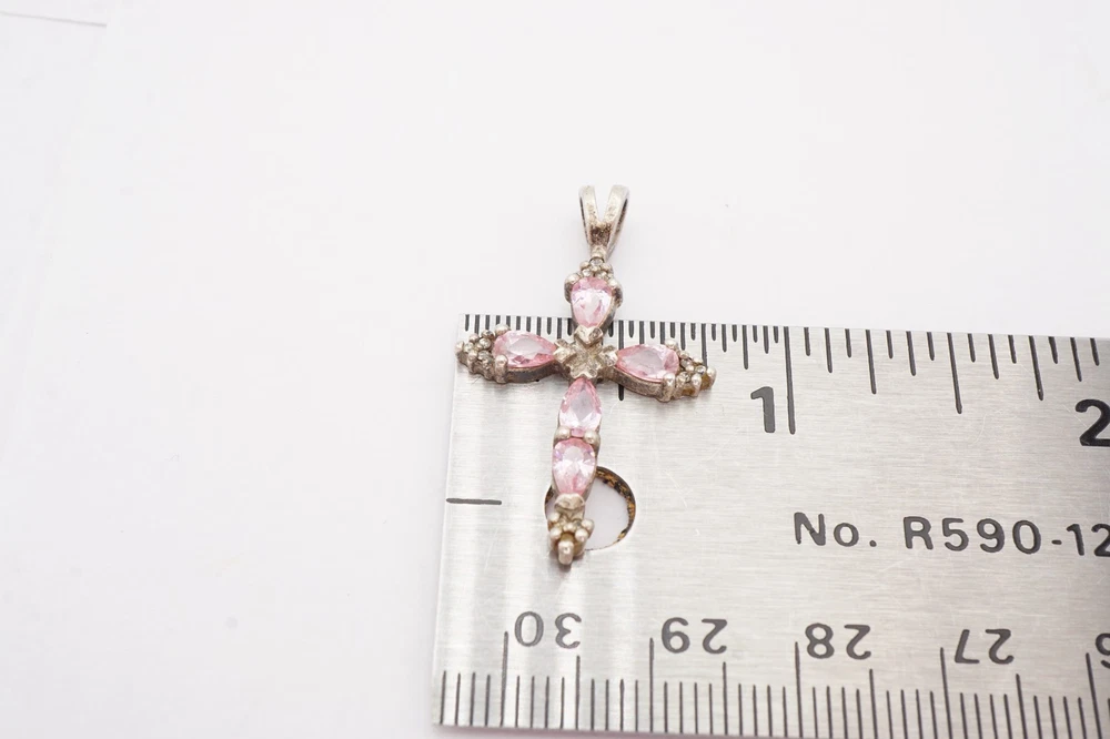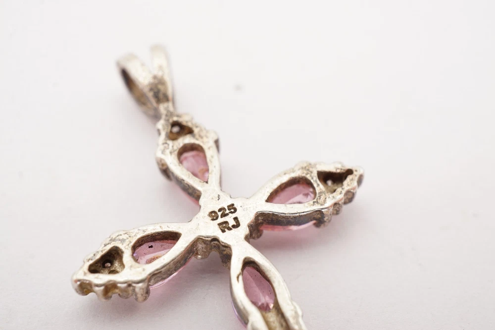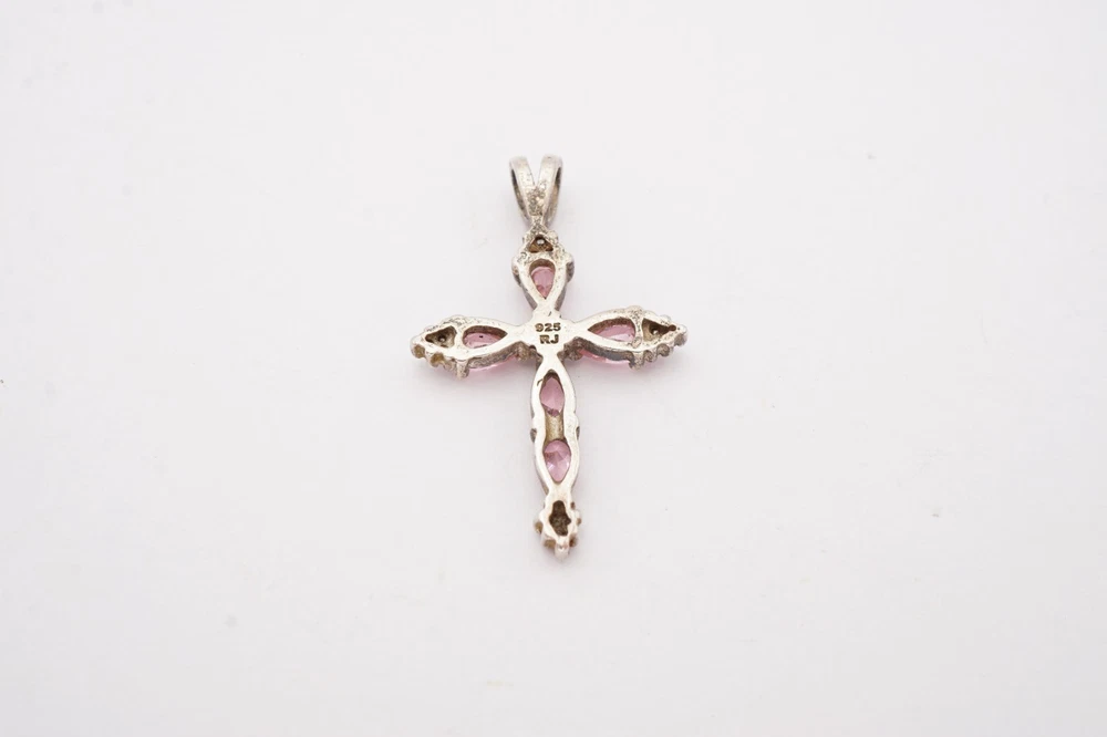 Sterling Silver 925 Pink Cubic Zirconia Cross Pendant Weight: 2.2 Grams Markings: 925 RJ Condition: Pre-owned Please see photos for further description and measurements. Feel free to ask any questions or concerns you may have about this item so you can make an educated decision about buying. Please check out our store for more great items!