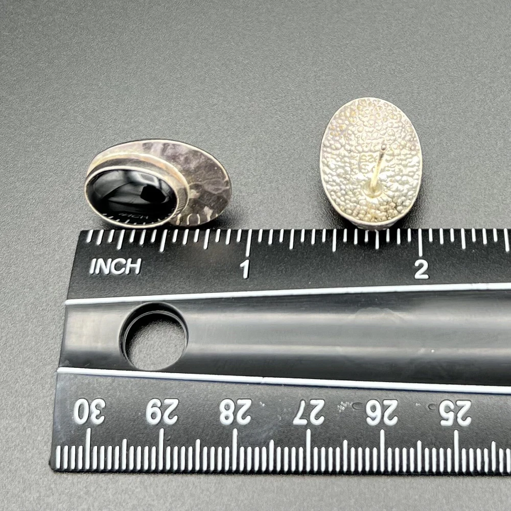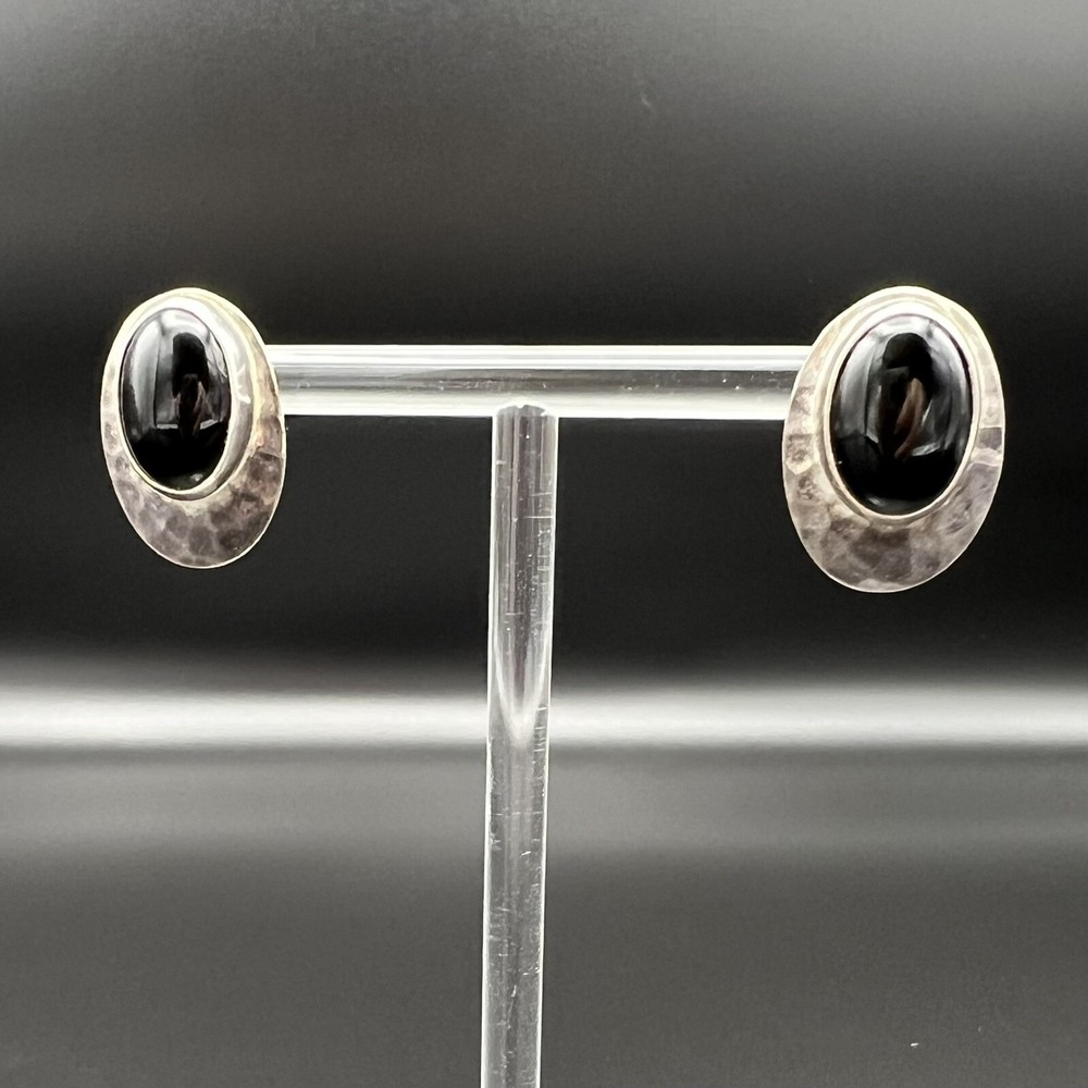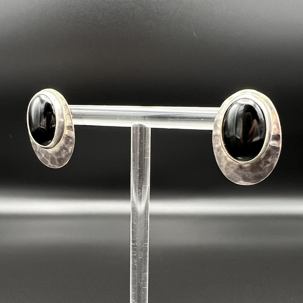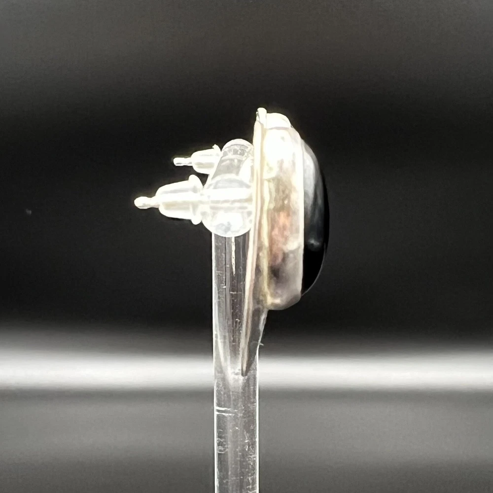 Lovely Native American style sterling stud earrings with black onyx cabochons. Signed with (c) copyright symbol and $. Excellent craftsmanship. Ships with silicone backers. Please review photos carefully; they are considered part of the description. Photos may be enhanced to show detail. Priced to move quickly! Make an offer!