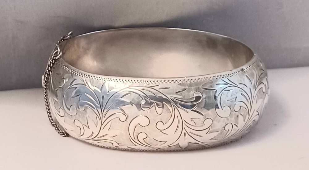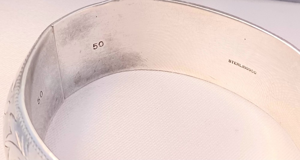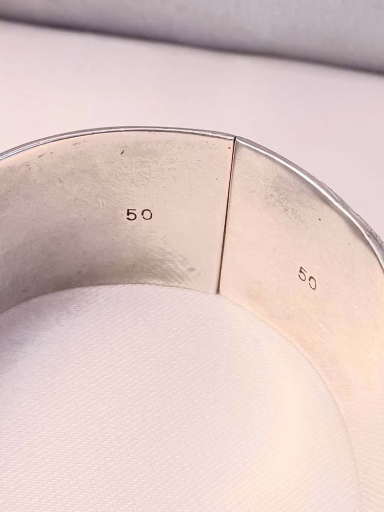 This Beautiful Sterling 950 Etched Hinged Wide Bangle is in excellent condition. This Piece Measures 1 1/8" wide 6 3/4" circumference and weighs 45 grams. This piece is marked 50 Sterling 950 Add a touch of elegance to your outfit with this beautiful sterling 950 etched hinged wide bangle. Crafted with precision, this bracelet showcases a unique design that is sure to catch the eye of any jewelry lover. The bangle is wide and comfortable to wear, with a hinged design that allows for easy movement. Made with high-quality materials, this bracelet is built to last. The etched design adds a touch of sophistication, making it the perfect accessory for any occasion. Whether you're dressing up for a formal event or adding a touch of glamour to your everyday look, this bracelet is sure to impress.