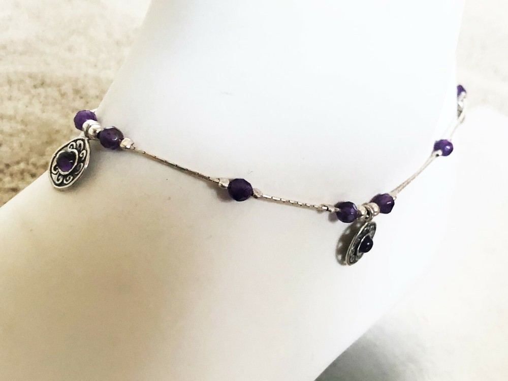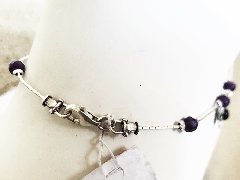 Absolutely love this ankle bracelet! The deep purple amethyst stones are stunning and catch the light beautifully. The sterling silver is high quality, and the lobster clasp is secure but easy to fasten. It’s lightweight yet feels durable, and the length fits perfectly. Such an elegant piece—great for adding a little sparkle to any outfit. Highly recommend!