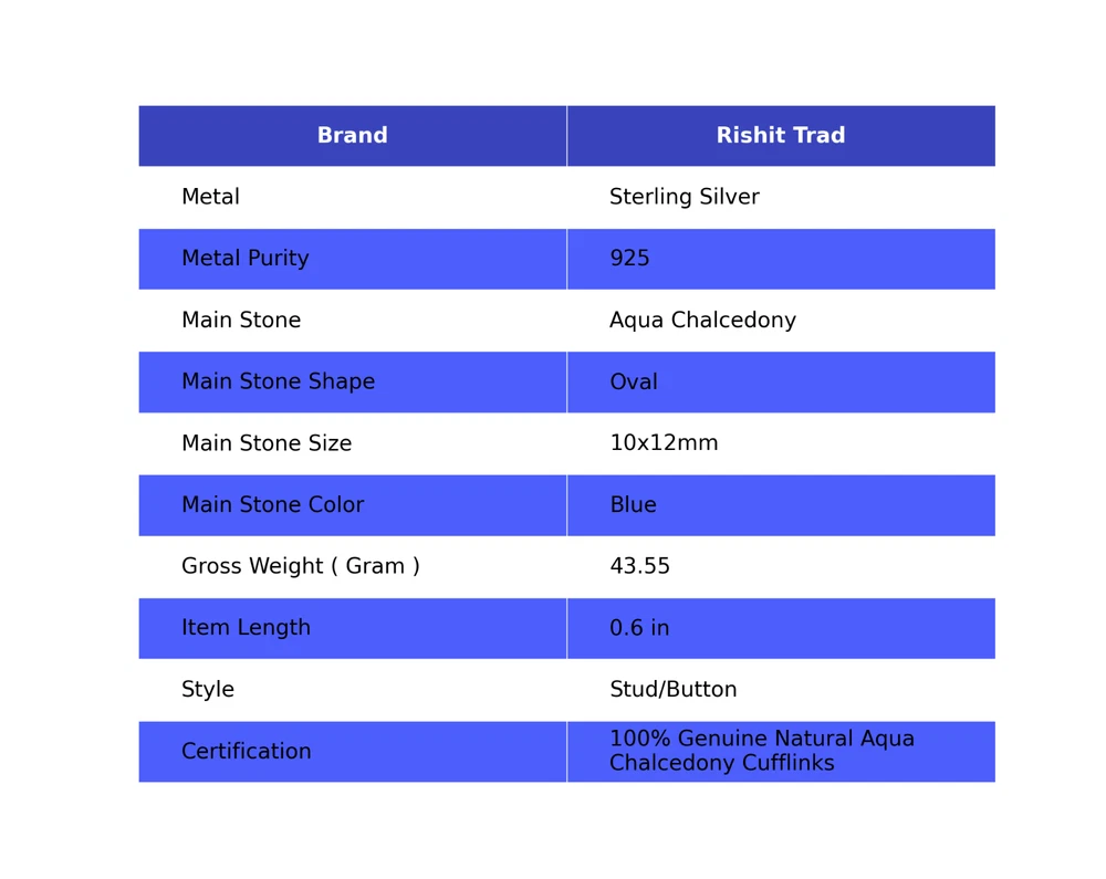 Make your look hypnotic and charming with this classy Cufflinks studded with Aqua Chalcedony featuring fascinating alluring 925 Sterling Silver finish. Stylish floral design make it flamboyant and elegant that you can wear it on parties or on a special event. ---------------------------------------------------- ------------ Welcome to Our Shop Rishittrad ---------------------------------------------------- ------------ Description:- SKU :- CL-1-20 Metal :- Sterling Silver Metal Purity :- 925 Gemstone :- Aqua Chalcedony Gemstone Color :- Blue Gemstone Shape :- Oval Gemstone Origin :- Setting :- Channel-Set Cufflink Lenght : - 0.6 Inches ---------------------------------------------------- ------------ -------- ------------ Elegant Birthday Tribute:- Discover the essence of sophistication with our Birthday Radiance collection. Crafted with exquisite attention to detail, each piece embodies the timeless elegance and symbolic significance of birthdays. Craftsmanship Excellence:- Meticulously fashioned from premium 925 sterling silver, our jewelry pieces boast a classic and enduring design. The rich tones of natural gemstones complement the silver setting, creating a captivating harmony that resonates with wisdom and truth. Symbol of Personal Growth:- Gift with intention and meaning. Our Emblem of Wisdom pieces symbolize heartfelt wishes for personal growth and enlightenment on the recipient's special day, making it a cherished gesture of love and appreciation. Versatile Elegance:- Measuring at 1.2 inches, our creations seamlessly blend into any ensemble, offering both daily wearability and the ability to elevate sophisticated looks for special occasions. Their adaptable design ensures they become treasured additions to any jewelry collection. Thoughtful Expression of Love:- Surprise your beloved with a gift that transcends mere adornment. Our Natural Gemstone 925 Sterling Silver collection is a stylish and thoughtful token, exuding elegance and emotion while conveying warmest wishes with enduring grace. Exquisite Presentation:- Delight in the joy of gifting with our meticulously presented pieces, elegantly housed in an exquisite gift box. Make their birthday truly memorable by presenting them with a gift that captures the allure and timeless elegance of sterling silver. -------------------------- Image Policy----------------------------- All images are captured in natural lighting. The product showcased is the exact item you'll receive. -------------------------- Delivery Policy-------------------------- Standard Shipping typically takes 15-25 days, depending on your location. For expedited shipping, additional charges will apply. --------------------------- Product Policy--------------------------- You will receive the exact product depicted in the photos. All items are meticulously handcrafted. ------------------------------ Order Policy------------------------------ We welcome orders from around the globe. Custom orders are also accepted. Bulk orders are available upon request. Should you have any queries about our products, please don't hesitate to reach out. Upon receiving your product, we'd appreciate your feedback. ⋆⋆✦✧✦⋆⋆⋆⋆✦✧✦⋆⋆⋆⋆✦✧✦⋆⋆⋆⋆✦✧✦⋆⋆⋆⋆✦✧✦⋆⋆⋆⋆✦✧✦⋆⋆⋆⋆✦✧✦⋆⋆ "Discover a captivating collection of handcrafted gemstone jewelry at our boutique." https://www.ebay.com/str/rishittrad0 ♥ Thank you for choosing us ♥