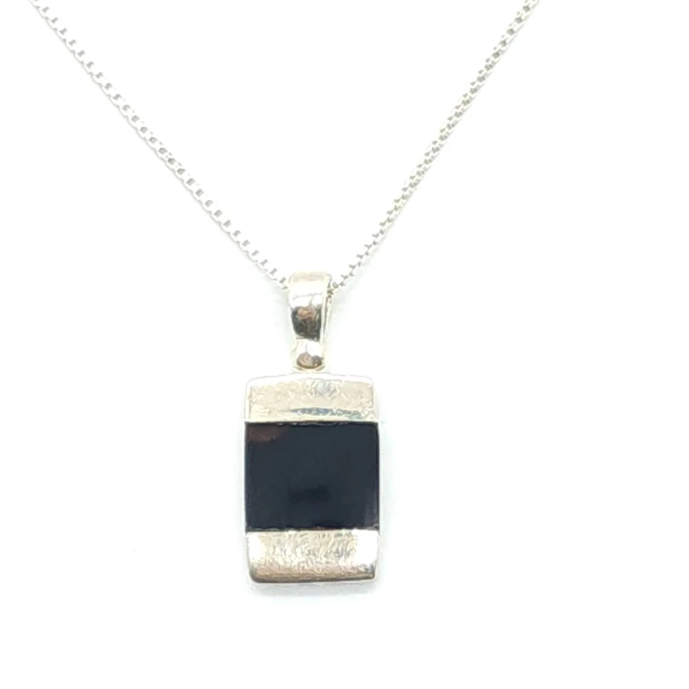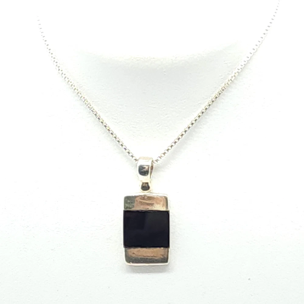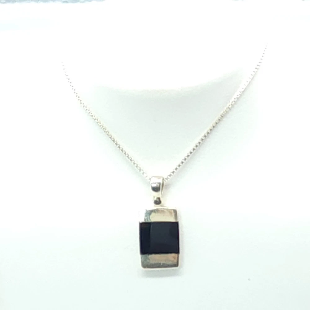 Sterling Silver Box Chain w/ Black Onyx Pendant Size: 18" Long X 1mm Wide Pendant: 0.88" Tall X 0.38" Wide X 0.09" Thick ** Stamped & Tested 2.58dwt 4.00g 0.14oz S. HE / Y. EE