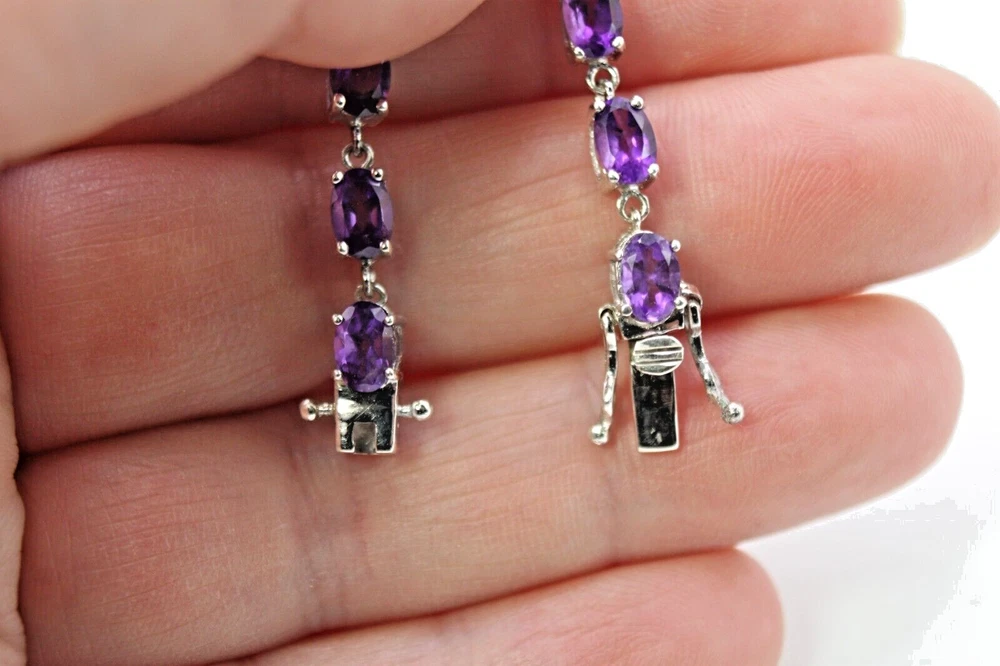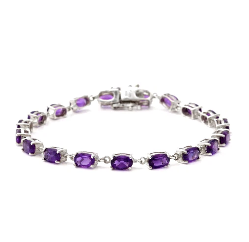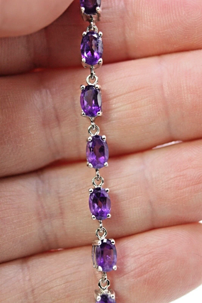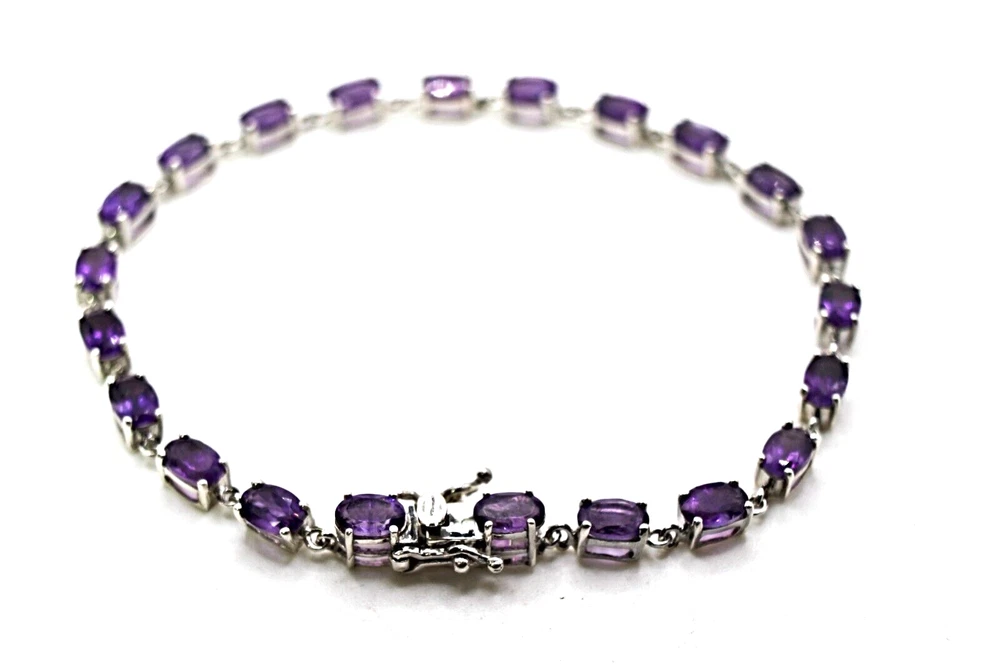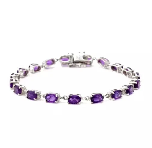 Solid sterling silver 925 stamped white rhodium coated bracelet featuring oval cut faceted genuine natural mined purple amethyst gemstones each measuring 6mm x 4 mm set into a simple tennis style bracelet with a slide fastening and figure of eight safety clasp each side. The bracelet measures 8 inches long by 5mm wide. Total weight 9.24 carats / 12g GIFT BOXED Thanks for looking and please take time to view my other listings #17970