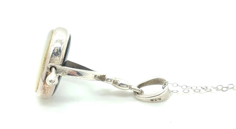 Sterling Silver Chain with Black Onyx & Mother of Pearl Reversible Pendant Size: 18" Long X 1.0mm Wide Pendant: 1.42" Tall (with bail) X 0.81" Wide X 0.25" Thick Stones: 0.57" Tall X 0.42" Wide 3.77dwt 5.87g 0.21oz ** Stamped & Tested A. EE / U. EE