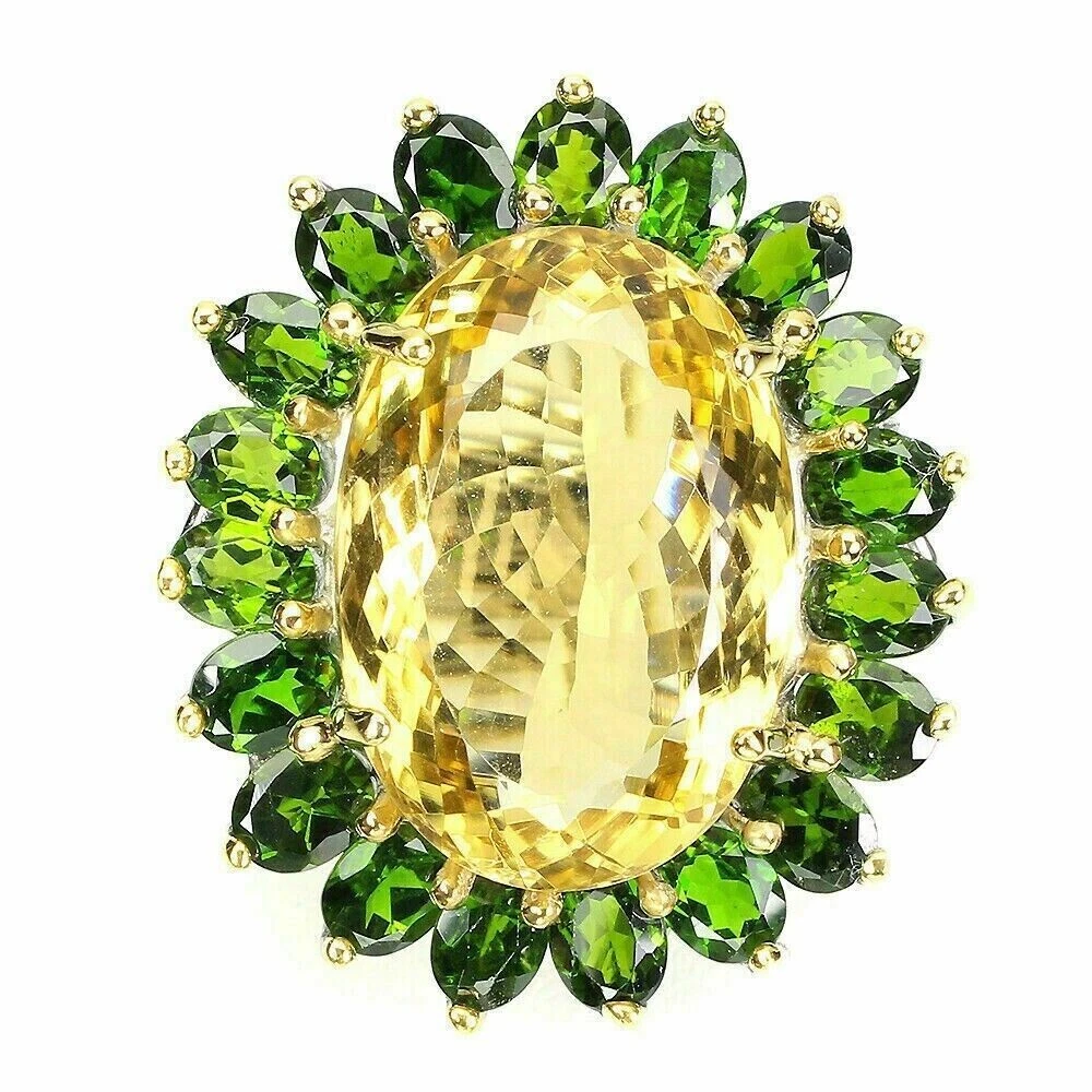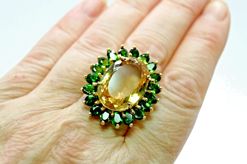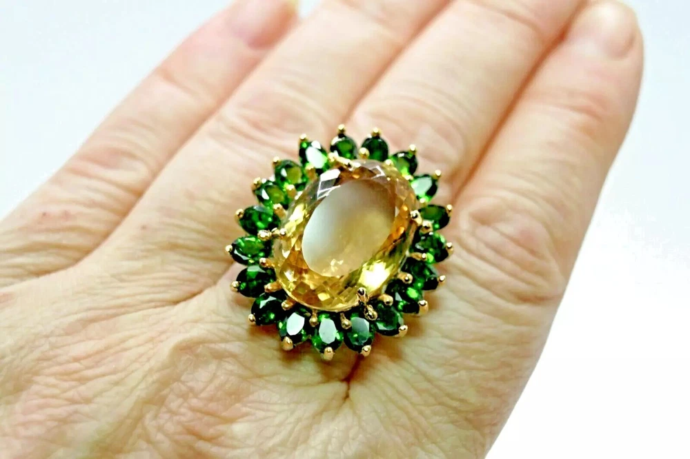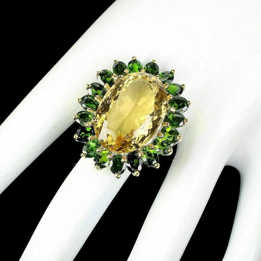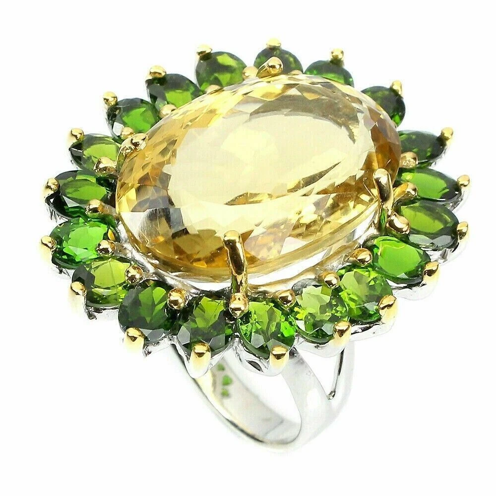 Solid sterling silver 925 stamped white gold coated ring set with a 22.4 carat central oval cut faceted genuine natural mined golden citrine gemstone which is surrounded by oval cut faceted genuine natural mined green chrome diopside gemstones each measuring 5mm x 4mm with the prongs being yellow gold coated. The face of the ring measures 33mm x 28mm and it is a size S 1/2 (US 9.5). GIFT BOXED Thanks for looking and please take time to view my other listings. #16477