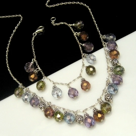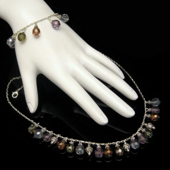 Lovely Sterling and Crystals Set Bali Style Beads, Multi Colored Crystals A beautiful Sterling Silver and crystal beads necklace and bracelet set. They both feature beautiful colored crystal dangles and Bali style Sterling beads, attached to Sterling chains. The crystal beads have a slight iridescent finish to add some extra sparkle. Both have secure lobster claw clasps and the necklace is adjustable via an extender chain. This is a wonderful set to wear with any outfit, as the variety of colors coordinates well with almost anything. A great looking, brilliant set that you will love wearing and that everyone will admire! Important Size Note: Please note that photos and jewelry displays show enlarged and closeup views. Please refer to the Measurements and Details section for actual dimensions. Thank you. Measurements and Details Necklace Length: Adjusts from 16 1/4 to 19 1/4 inches (41.2 to 48.8cm) Bracelet Length: 7 inches (17.7cm) Crystal Beads Size: About 5/16 inch (8mm) Bali Beads Size: About 1/4 inch (6mm) Clasp Type: Both pieces have secure lobster claw clasps Hallmarks: Stamped "925" on clasps Condition: New Don't miss out - this is a very unique Sterling Silver jewelry set that you won't see anywhere else, and only one is available. Click and buy it now before someone else does! Shipping Information Next Day Shipping: Items are usually shipped the day after purchase. Shipping days are Monday through Friday (except on U.S. Postal Holidays). International Customers Please Note: Shipping Fees DO NOT include import or customs fee or taxes charged by your country on imported items. U.S.A. Law requires the correct sale amount on all customs forms. Please contact your country's tax authorities to calculate any import duties or tax BEFORE making your purchase. Thank You. U.K Buyers Please Note: Royal Mail assesses an additional handling fee for all items requiring a VAT and/or Customs Import Duties. Fees can be verified at www.gov.uk/goods-sent-from-abroad/tax-and-duty. Thank You.