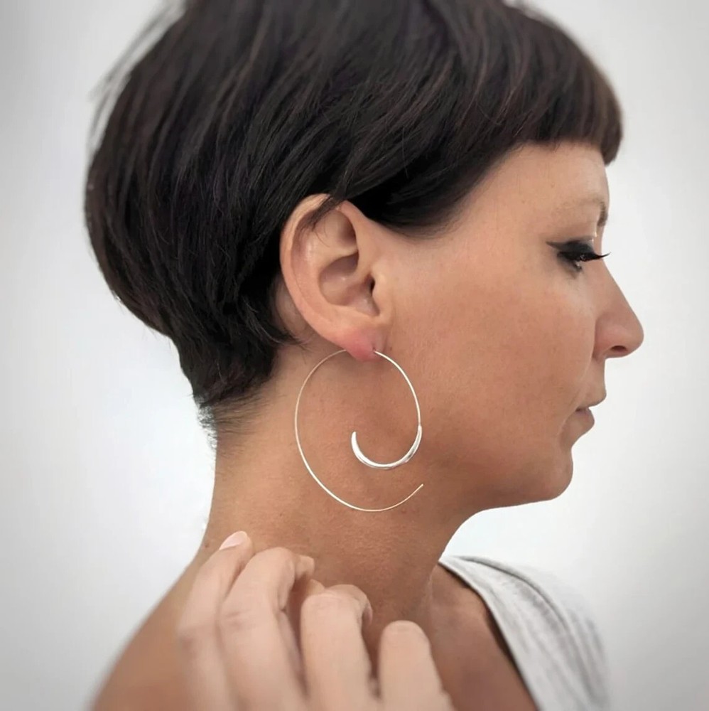 Large liquid drop round spiral earrings in sterling silver. Nickel FREE Large dangling spiral threaders in high polished silver with a weighted liquid drop at the end which lends itself the the elegant ondulating motion when worn. 1mm thick round silver wire threaders with a simple yet sleek design. Very popular for Tribal style Boho jewellery lovers. Flexible wire can be worn with ease and look stunning on. Buy Now! Dimensions: Spiral Diameter: 5.5 cm Weight: 6.7 grams per pair SOLD ONLY IN PAIRS! Delivery Information All items dispatched from the UK. Item will be carefully packaged in eco-packaging to safeguard it during delivery and with our branded satin pouch ready as a gift. Standard Tracked 48 Shipping with Royal Mail or Yodel included FREE . Tracking number details will be sent after dispatch (which is usually within 1 working day of purchase. Weekends/festivities excluded). Faster shipping options also available for the UK. Worldwide shipping available with Royal Mail Tracked & Signed. Returns accepted within 14 days of receipt. At customers’ expense.
