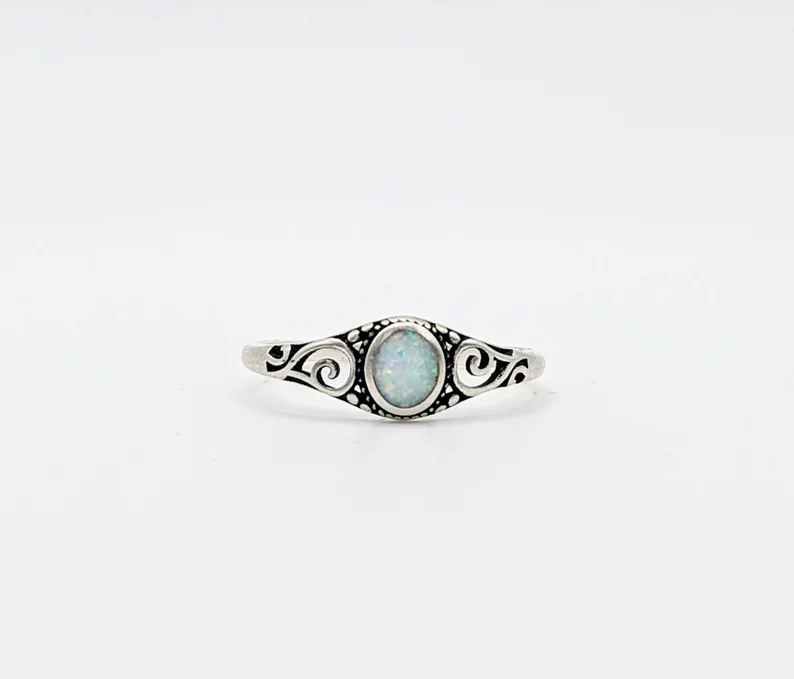 Introducing our Swirls Opal Sterling Silver Ring. This ring can be worn as a midi, a stackable, a promise ring, or by itself as a statement ring. Crafted from high quality .925 sterling silver. Gifting: Looking for the perfect gift for the special women in your life? Explore our stunning collection of rings for women, including beautiful stackable rings that make ideal gifts for Mother's Day, birthdays, anniversaries, and Christmas. Whether you're celebrating a milestone or simply showing appreciation, our handpicked selection offers something for every occasion. Discover the joy of giving with our exquisite range of rings, guaranteed to make any birthday or anniversary unforgettable. Care: Ensure your sterling silver jewelry maintains its stunning shine with proper care. To keep your pieces looking their best, gently polish them with a soft cloth regularly to remove any tarnish. Avoid exposing sterling silver to harsh chemicals, such as chlorine or household cleaners, which can cause damage. When not wearing your jewelry, store it in a cool, dry place away from sunlight to prevent tarnishing. With a little care and attention, your sterling silver pieces will continue to sparkle for years to come.
