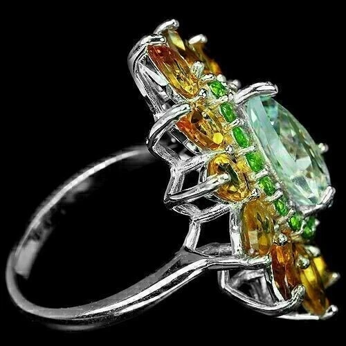 Solid sterling silver 925 stamped white gold coated ring in a cluster design featuring a pear cut faceted genuine natural mined heated blue topaz gemstone measuring 12mm x 8mm surrounded by a row of genuine natural mined green chrome diopside gemstones each measuring 2mm x 2mm which are then surrounded by pear cut faceted genuine natural mined golden citrine gemstones each measuring 6mm x 4mm. The face of the ring measures 29mm x 24mm and it is a size O (US 7.25). GIFT BOXED Thanks for looking and please take time to view my other listings #11390