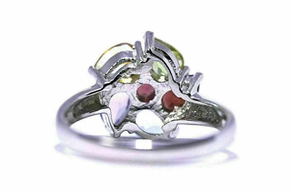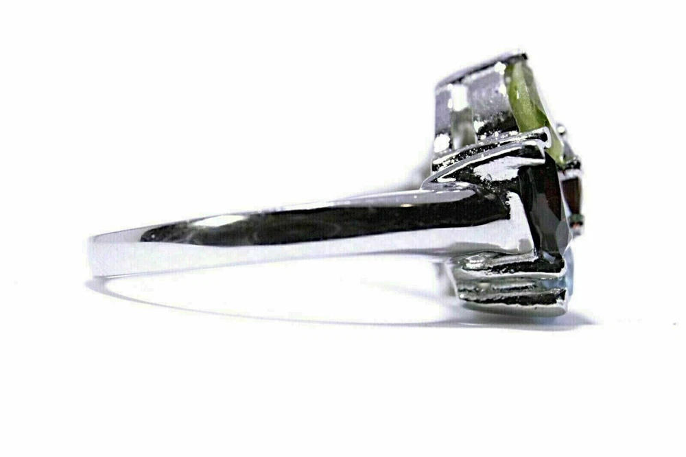 Solid sterling silver 925 stamped white gold coated cluster multigem ring featuring 7mm x 5mm pear cut faceted genuine natural mined gemstones in golden yellow citrine, green peridot, red garnet, purple amethyst and heated blue topaz with a further 5mm x 5mm round cut faceted red garnet gemstone in the centre. The face of the ring measures 15mm x 15mm and it is size S (US 9.5). GIFT BOXED Thanks for looking and please take time to view my other listings #1548