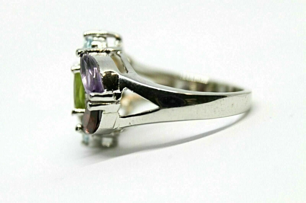 Solid sterling silver 925 stamped white gold coated ring featuring 8mm x 4mm marquise, 8mm x 6mm oval and 3mm x 3mm round cut faceted genuine natural mined gemstones in purple amethyst, red garnet, golden citrine, green peridot and heated blue topaz. The face of the ring measures 23mm x 18mm and it is a size P (US 7.75). GIFT BOXED Thanks for looking and please take time to view my other listings #882