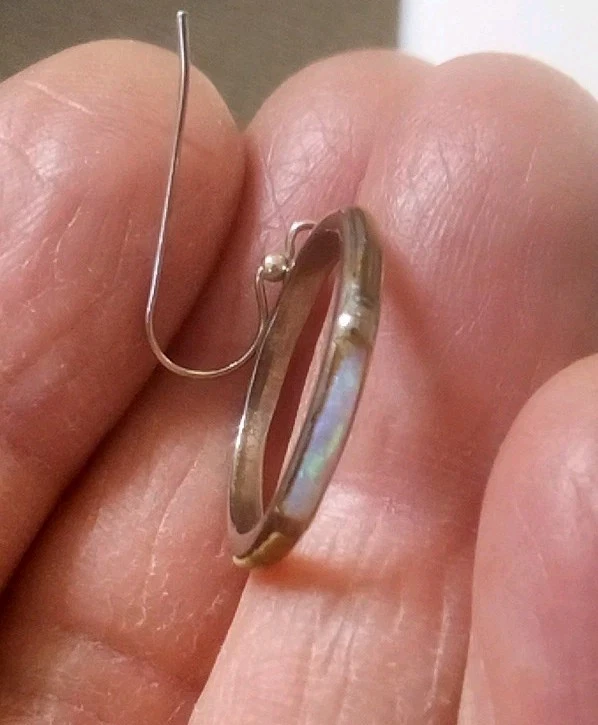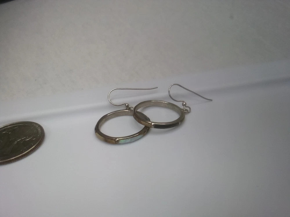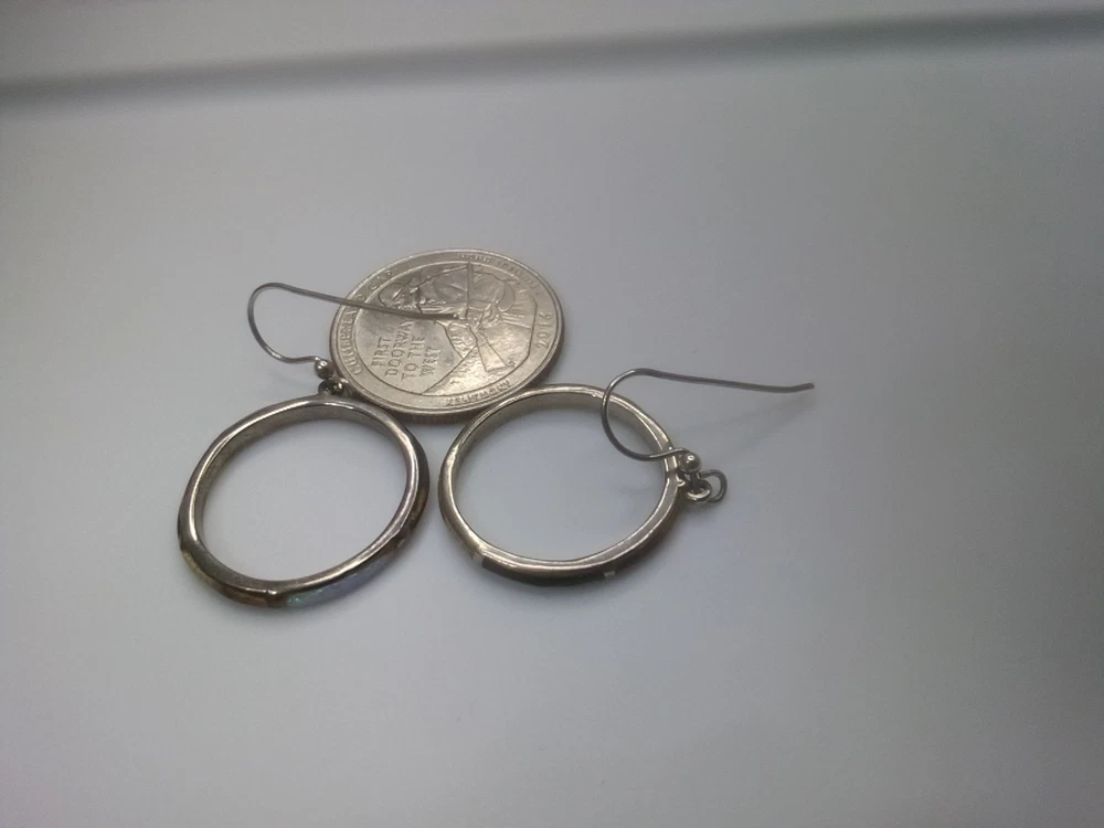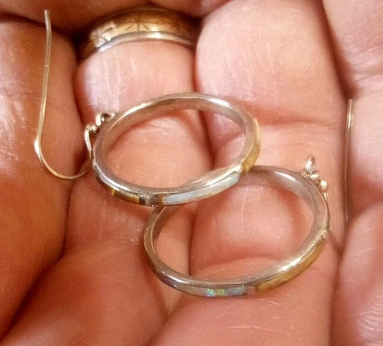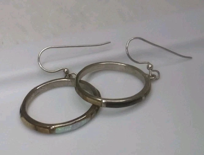 These Southwest-style hoop earrings feature multicolor inlay stones including opal and black onyx set in sterling silver. The earrings have a round shape and a hook closure for secure wear. Measuring 1.5" in length(Including hook), these statement earrings are designed for pierced lobes and showcase a blend of vibrant stones in a traditional Southwestern design. Although not signed, these handmade earrings are crafted in the United States, adding a touch of artisanal charm to any outfit. These earrings are unmarked but tested to be 935 sterling silver. In good condition with normal wear due to age and use. Please see attached photos and feel free to message questions.