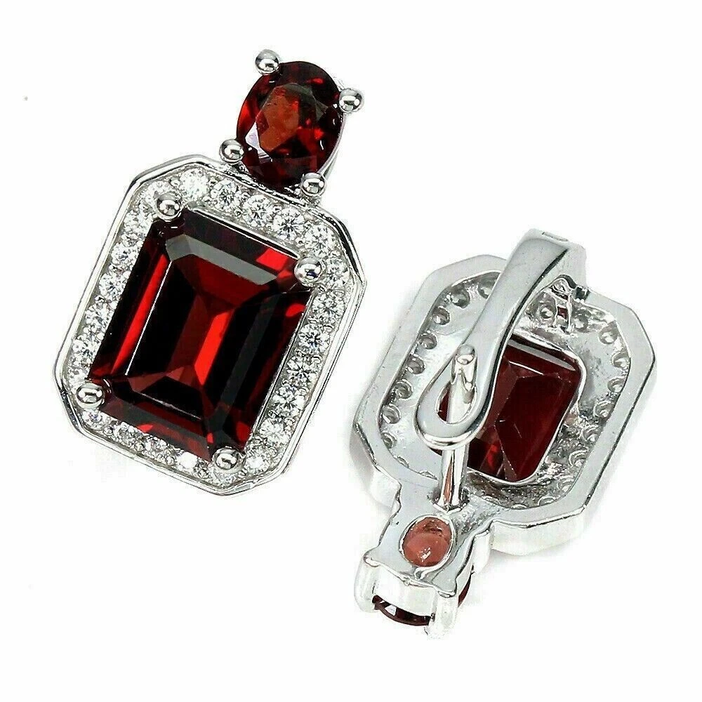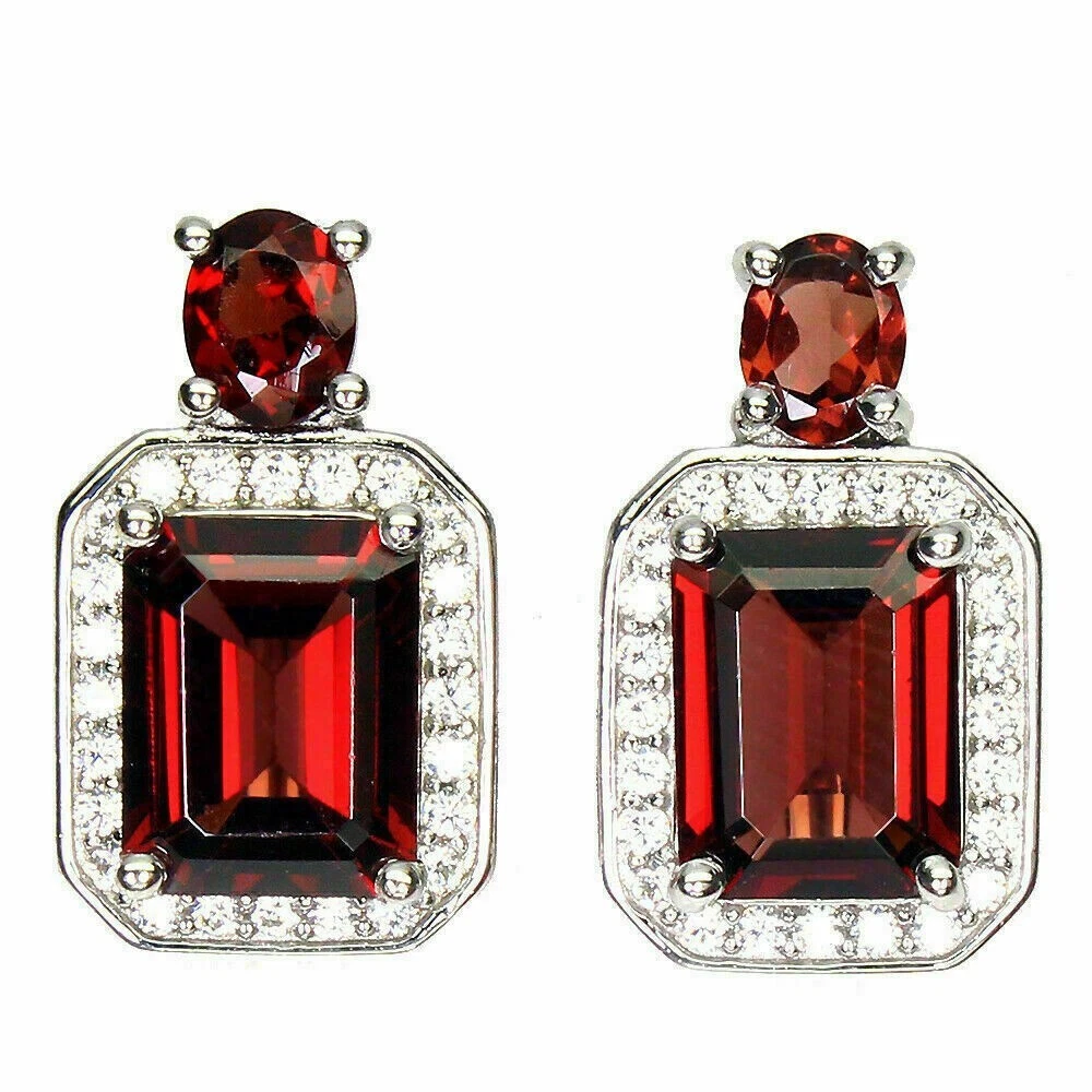 Solid sterling silver 925 stamped white gold coated earrings featuring a central emerald cut faceted genuine natural mined red garnet gemstone measuring 9mm x 7mm set into a border of bright white round cut faceted lab created zircon stones each measuring 1mm x 1mm and with a further 5mm x 4mm oval cut faceted red garnet gemstone set above. The earrings measure 18mm x 12mm and have a leverback fastening. GIFT BOXED Thanks for looking and please take time to view my other listings #16490 / 16559