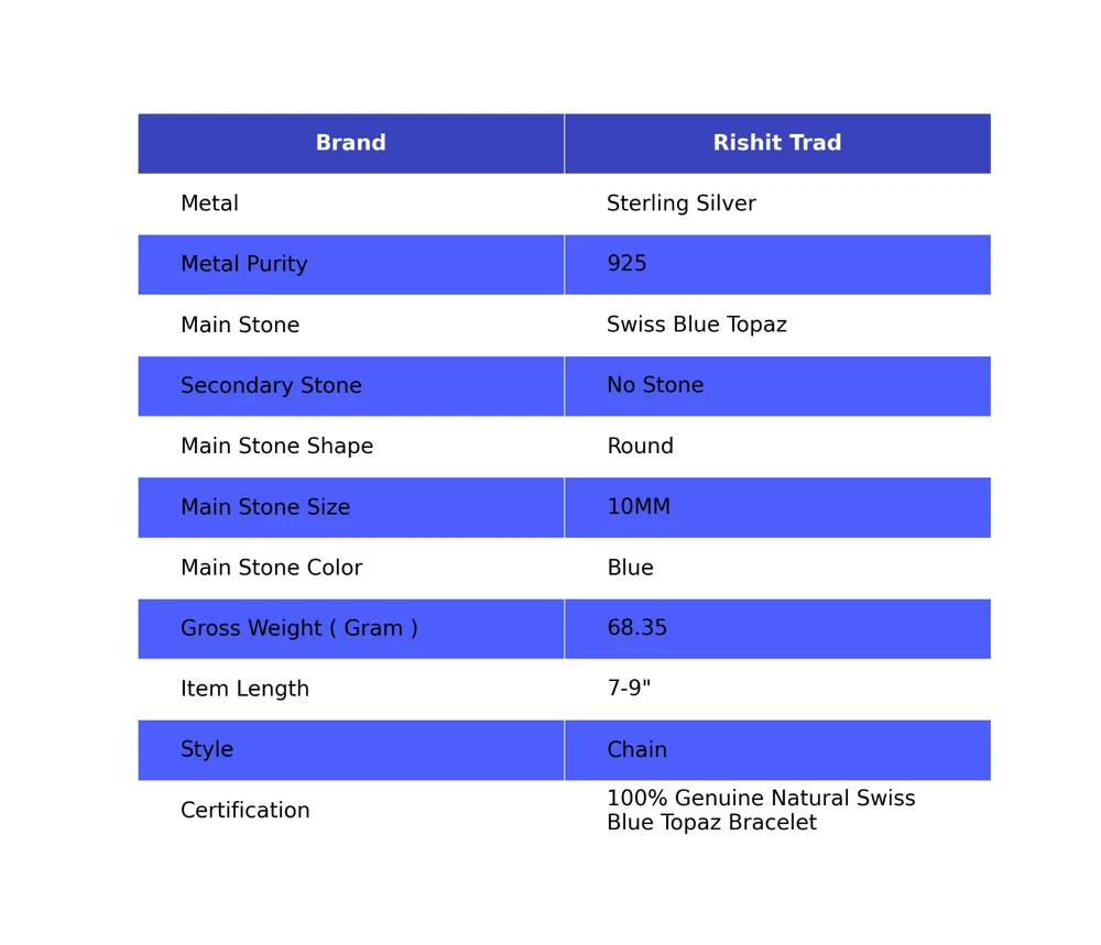 Dive into the magical temptation of this stunning Bracelet in attractive shape and design made of Sterling Silver studded with Swiss Blue Topaz. An essential ornament to add in your jewellery collection! ---------------------------------------------------- ------------ Welcome to Our Shop Rishittrad ---------------------------------------------------- ------------ Swiss Topaz Gemstone Chain Blue Bracelet 925 Sterling Silver Indian Jewelry Description:- SKU :- RB-13-1 Metal :- Sterling Silver Metal Purity :- 925 Gemstone :- Swiss Blue Topaz Gemstone Color :- Blue Gemstone Shape :- Round Gemstone Origin :- Setting :- Bracelet Length :- 7-9" InchesDive into the magical temptation of this stunning Bracelet in attractive shape and design made of Sterling Silver studded with Swiss Blue Topaz. An essential ornament to add in your jewellery collection! Bracelet Width :- InchesDive into the magical temptation of this stunning Bracelet in attractive shape and design made of Sterling Silver studded with Swiss Blue Topaz. An essential ornament to add in your jewellery collection! ---------------------------------------------------- ------------ -------- ------------ Elegant Birthday Tribute:- Discover the essence of sophistication with our Birthday Radiance collection. Crafted with exquisite attention to detail, each piece embodies the timeless elegance and symbolic significance of birthdays. Craftsmanship Excellence:- Meticulously fashioned from premium 925 sterling silver, our jewelry pieces boast a classic and enduring design. The rich tones of natural gemstones complement the silver setting, creating a captivating harmony that resonates with wisdom and truth. Symbol of Personal Growth:- Gift with intention and meaning. Our Emblem of Wisdom pieces symbolize heartfelt wishes for personal growth and enlightenment on the recipient's special day, making it a cherished gesture of love and appreciation. Versatile Elegance:- Measuring at 1.2 inches, our creations seamlessly blend into any ensemble, offering both daily wearability and the ability to elevate sophisticated looks for special occasions. Their adaptable design ensures they become treasured additions to any jewelry collection. Thoughtful Expression of Love:- Surprise your beloved with a gift that transcends mere adornment. Our Natural Gemstone 925 Sterling Silver collection is a stylish and thoughtful token, exuding elegance and emotion while conveying warmest wishes with enduring grace. Exquisite Presentation:- Delight in the joy of gifting with our meticulously presented pieces, elegantly housed in an exquisite gift box. Make their birthday truly memorable by presenting them with a gift that captures the allure and timeless elegance of sterling silver. -------------------------- Image Policy----------------------------- All images are captured in natural lighting. The product showcased is the exact item you'll receive. -------------------------- Delivery Policy-------------------------- Standard Shipping typically takes 15-25 days, depending on your location. For expedited shipping, additional charges will apply. --------------------------- Product Policy--------------------------- You will receive the exact product depicted in the photos. All items are meticulously handcrafted. ------------------------------ Order Policy------------------------------ We welcome orders from around the globe. Custom orders are also accepted. Bulk orders are available upon request. Should you have any queries about our products, please don't hesitate to reach out. Upon receiving your product, we'd appreciate your feedback. ⋆⋆✦✧✦⋆⋆⋆⋆✦✧✦⋆⋆⋆⋆✦✧✦⋆⋆⋆⋆✦✧✦⋆⋆⋆⋆✦✧✦⋆⋆⋆⋆✦✧✦⋆⋆⋆⋆✦✧✦⋆⋆ "Discover a captivating collection of handcrafted gemstone jewelry at our boutique." https://www.ebay.com/str/rishittrad0 ♥ Thank you for choosing us ♥