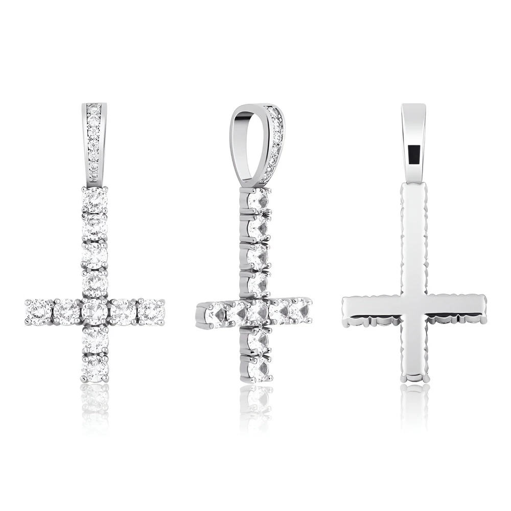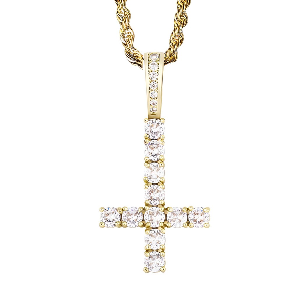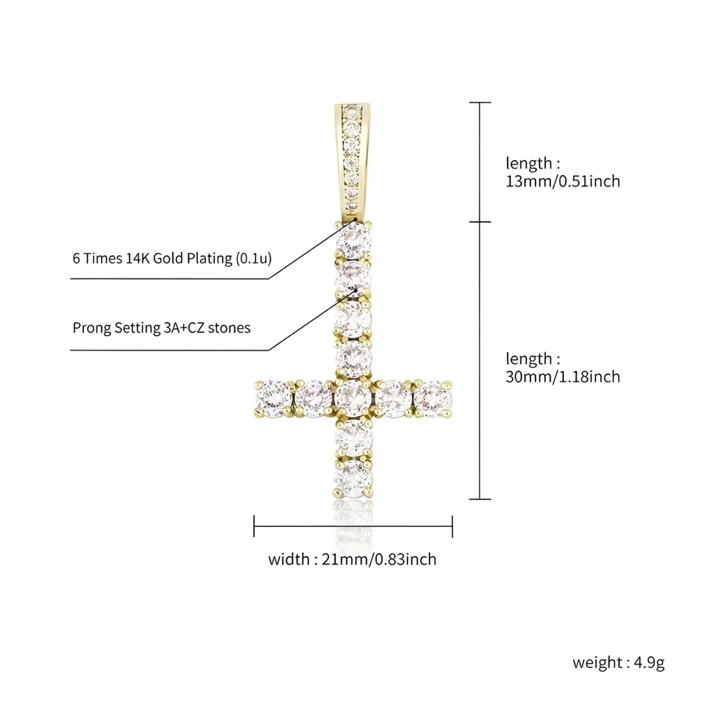 Sterling Silver Upside Down Cross Necklace with 14K Gold Filled CZ Hip Hop Pendant