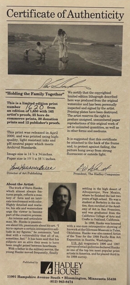 STEVE HANKS " Holding the Family Together " 1650 Limited Edition Print 14.75" Height x 34" Width image size MINT CONDITION Steve Hanks Although teachers often cited his artistic ability, Steve Hanks’ main interest while growing up around San Francisco was sports. As a young teenager, Hanks pursued surfing and tennis with passion. He eventually tired of a steady diet of competitive tennis, but continued to surf, finding a spiritual connection with the ocean. “Surfing had a strong influence on my paintings,” he says. “The ocean often appears in my work, because I have such strong feelings for it.” Although it was apparent early on that he had talent, Hanks refused to do the required assignments in his high school art class and earned a grade of C in the class. “To prove I was good, I did a one-man show at the high school and sold my first painting to another art teacher,” he says. After high school Hanks enrolled in summer session commercial art courses at the Academy of Art in San Francisco. “The only way I could convince my parents to let me go was to say I was going into commercial art,” he says. “I didn’t even know what that was!” He did well in his commercial art classes, but it was a life drawing class that captured his interest. He focused his energy on the study of anatomy and figure drawing and transferred into the California College of Arts and Crafts in Oakland, California. He graduated in the 1960s with a Bachelor of Fine Arts degree, and then moved back to New Mexico in search of a home art gallery. Initially, he drew in pencil and painted in oils. His paintings were impressionistic while his drawings were more realistic. Eventually, an allergic reaction to oils forced him to experiment with watercolors. Using the techniques learned from other mediums, he found he could create watercolors as “finished” as oils. Deeply affected by the emotions, shifting attitudes and music of the 1960s, the music of 60s icon Bob Dylan often accompanies Hanks as he paints in his studio today. Steve Hanks’ paintings are much more than endearing images of women and children. Rather than conveying a specific message through his paintings, Hanks prefers to explore memories and emotions. “All art is an escape to somewhere you want to be or a feeling you want to have," Hanks says. "People see different things in my paintings because we all have different backgrounds and feelings.” Hanks highly collected nudes convey an introspective solitude that prompts the viewer to think about his or her own life and path. “Women occupy a special niche in my sensitivity. They express more storytelling ability. There’s more magic in them,” he says. Art jurors began recognizing the quality of his work in 1973. Steve Hanks won the Arts for the Parks Marine Art Award of Excellence in 1990 and 1994, and has been one of the Arts for the Parks top 100 artists since 1989. In 1991, Steve Hanks received the National Watercolor Society Merit Award and the National Academy of Western Art awarded him the Gold Medal in 1992. Since 1993, he has been one of U.S. Art Magazine's top ten American artists. When the Pacific Rim show in Seattle, WA decided to open the show up to a wider variety of art in 1999, they selected Steve as Artist of the Year. Steve was one of five winners selected to the U.S. Art Hall of Fame 2000. He was named as one of the top 25 selling artists in the June, 2002 issue of Decor magazine. The 7th Annual Andre Agassi Grand Slam for Children chose Steve as their Feature Artist in 2002. This is a limited edition Print signed and numbered by Steve Hanks . It is in perfect, mint condition. It has its certificate of authenticity and write up on this incredible artist. This Print is guaranteed to arrive MINT and in perfect condition. We offer free shipping, completely insured everywhere in N. America! -------------------------------------------------------------------------------------------------------------------------------------------------------------------------------------------- Phone us toll free anywhere in N. America - anytime ! We are authorized dealers with almost every publisher in N. America and know we can list world class artists at remarkable prices !! We offer FREE pick up of winning items at our Canmore Art gallery located in Canada's beautiful Rocky Mountains. Shipping is done in some of the best built, strong boxes ever seen - always completely insured . Any problems and we ship a new piece immediately - no cost to you!! Think we have superior service, come check out our ART COUNTRY CANADA Gallery on your next visit to BANFF NATIONAL PARK . We will send an email within 24 hours of the auction ending. Canadian residents add GST. We accept paypal and anyone can call the gallery toll-free with a visa or mastercard. We try to ship the same day, but some items may ship the following week. Shipping Information All items are completely insured to arrive in MINT condition! We ship in some of the strongest boxes in the industry! Art Country Canada Gallery Art Country Canada Rocky Mountain Art Gallery 729 Main Street Canmore , Alberta T1W 2B2 Mill Pond Press Dealer / Somerset Publishing Dealer / Wild Wings Dealer and many more TERMS OF SERVICE EBAY is one side of our business, having a fine art gallery we are able to custom frame most items in our gallery. We work hard to do business the old fashioned way, we treat all customers as if they are family. We answer emails courteously and are fair in all our dealings. We have a toll free number for easy service. Please feel free to contact us at anytime, with any question or comment. We make every effort to answer all emails as quickly as possible. WORLDWIDE SHIPPING We sell and ship worldwide, so please email us for a quote to any location, we dropship to any address if it is a gift. We charge shipping based on the Canadian Postal System and all items are sent fully insured. METHODS OF PAYMENT We accept Paypal which ac