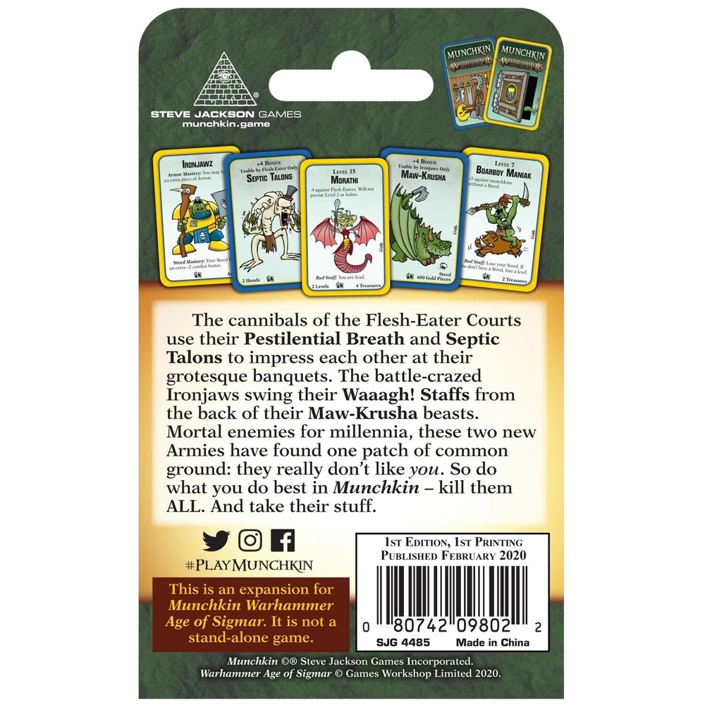 The cannibals of the Flesh-Eater Courts use their Pestilential Breath and Septic Talons to impress each other at their grotesque banquets. The battle crazed Ironjaws swing their Waaagh! Staffs from the back of their Maw-Krusha beasts. Mortal enemies for millennia, these two new Armies have found one patch of common ground: they really don't like you. So, do what you do best in Munchkin – kill them ALL and take their stuff. This is a 112-card EXPANSION for Munchkin Warhammer Age of Sigmar but can be added to any Munchkin game! Adds two new armies to your Munchkin Warhammer Age of Sigmar game: Flesh-Eater Courts and Ironjaws! 3-6 players 1-2 hours average play time Recommended for ages 10 and up