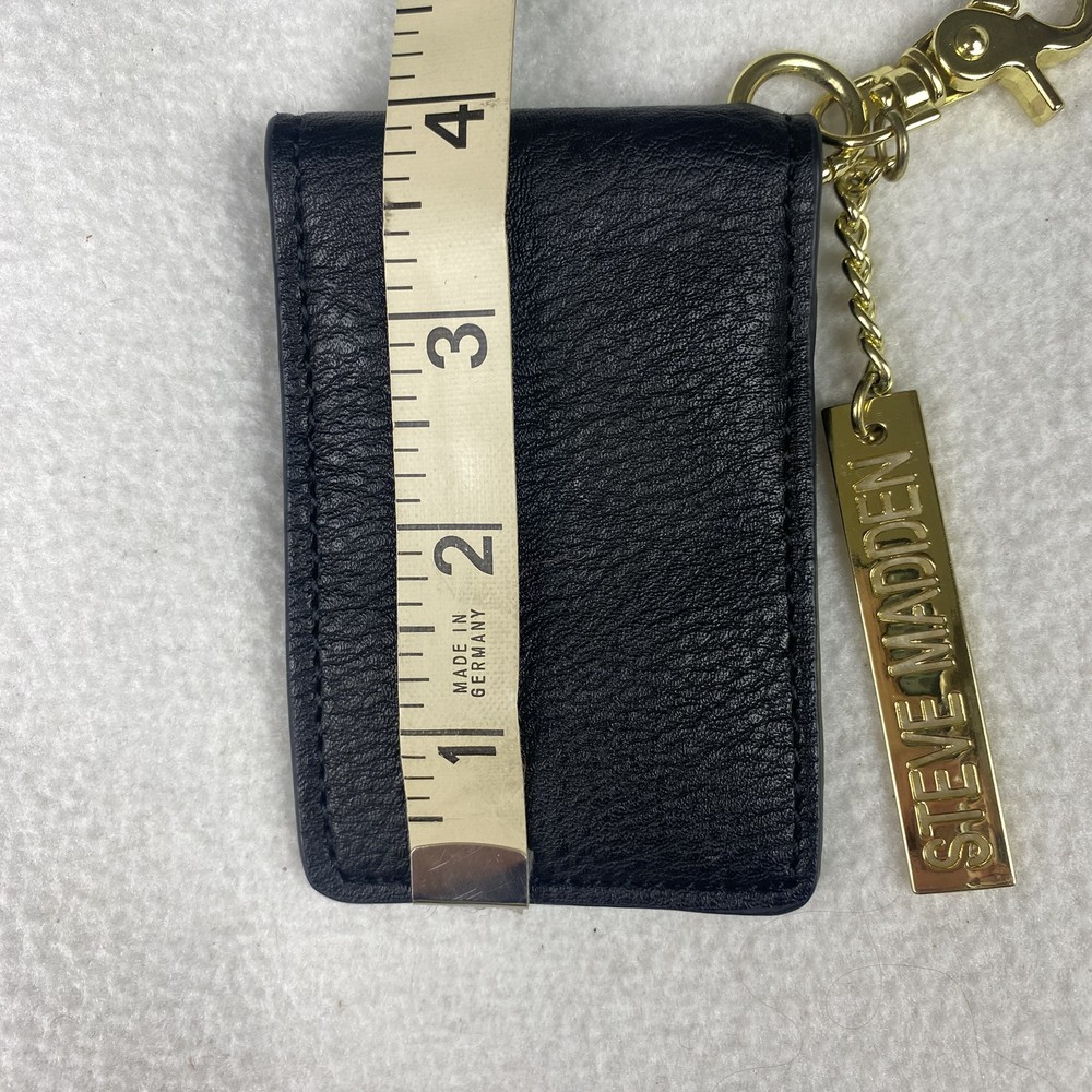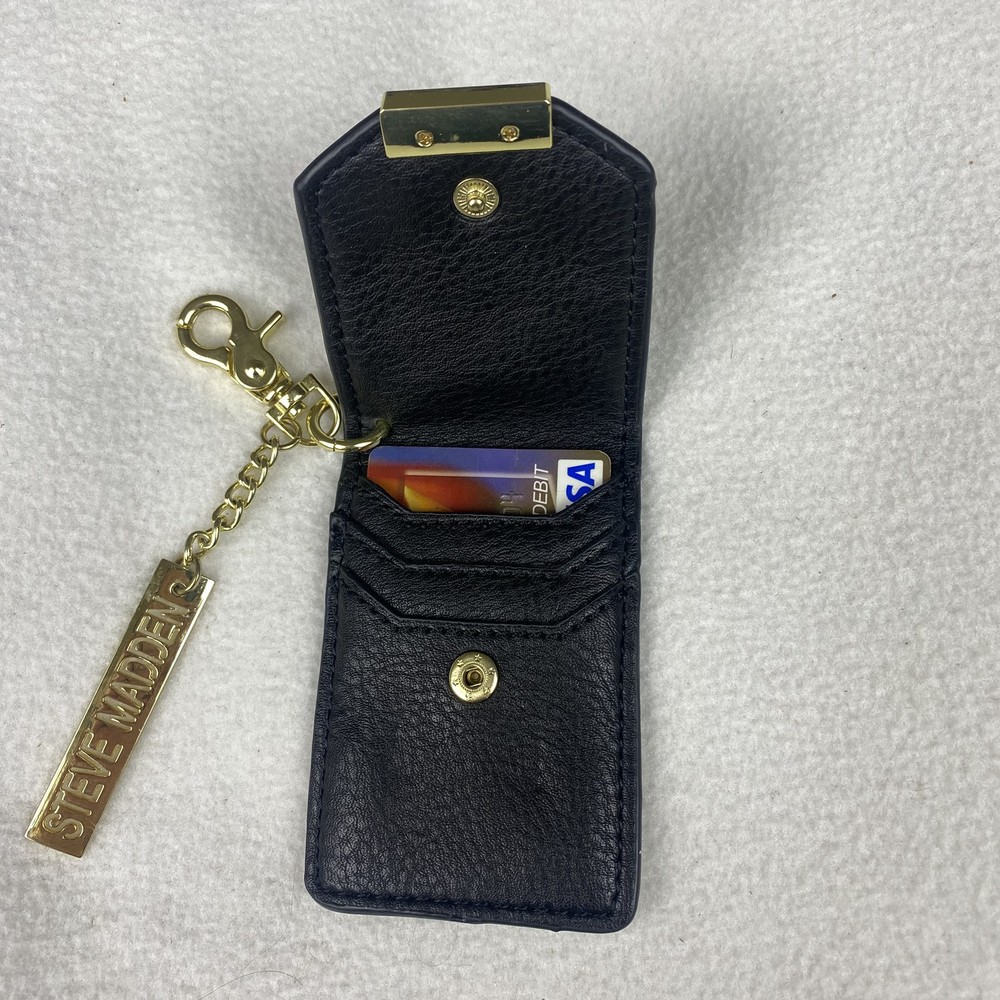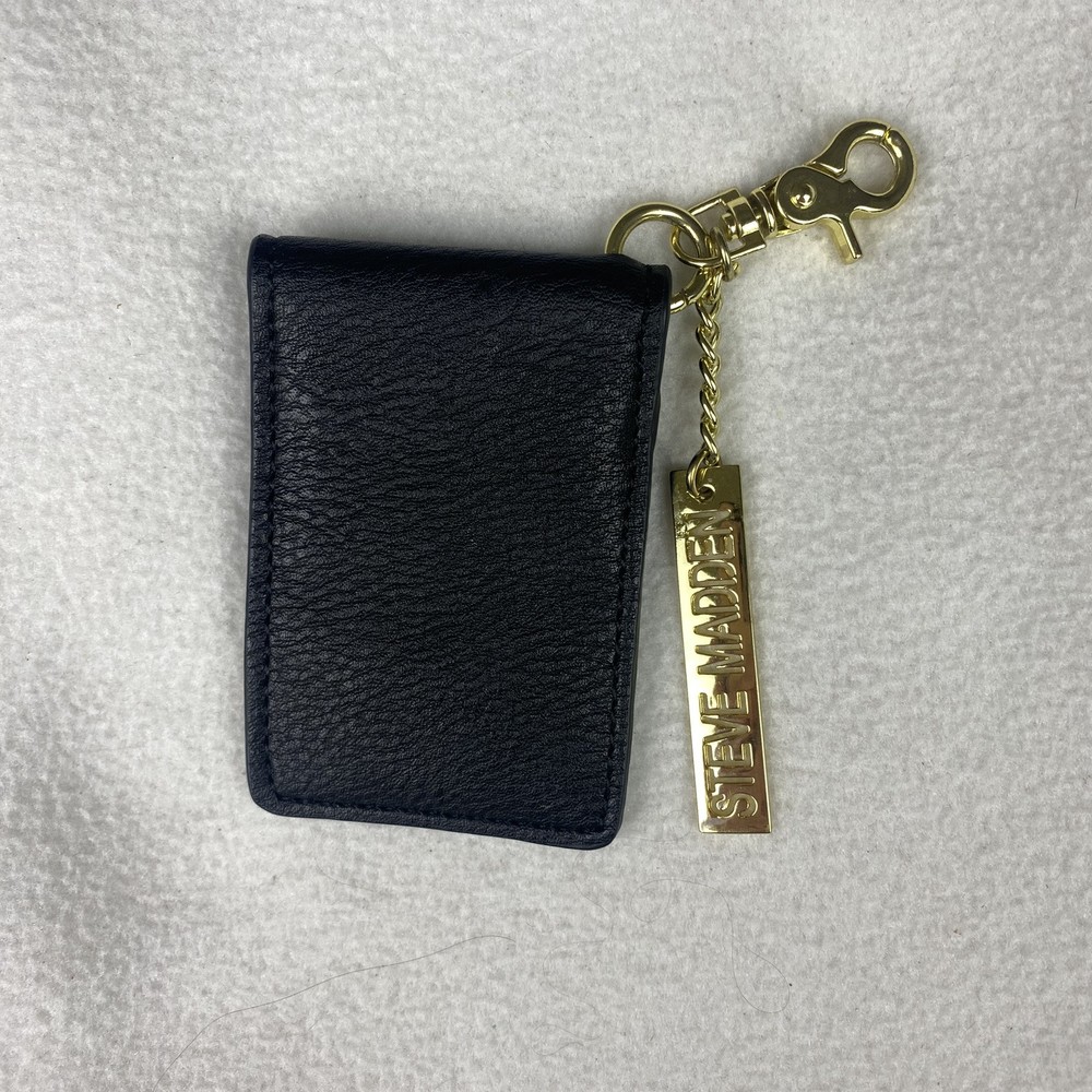 The Steve Madden Black Card Holder Charm and Keychain is a stylish accessory designed for women, featuring gold tone hardware for a touch of elegance. Perfect for keeping your cards organized and easily accessible while on the go, this keychain combines practicality with a sleek design, making it a versatile addition to any woman's accessory collection.