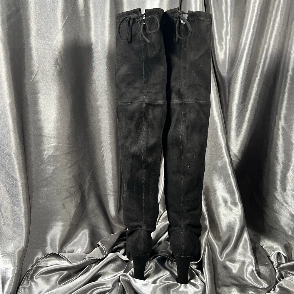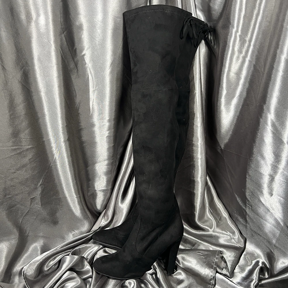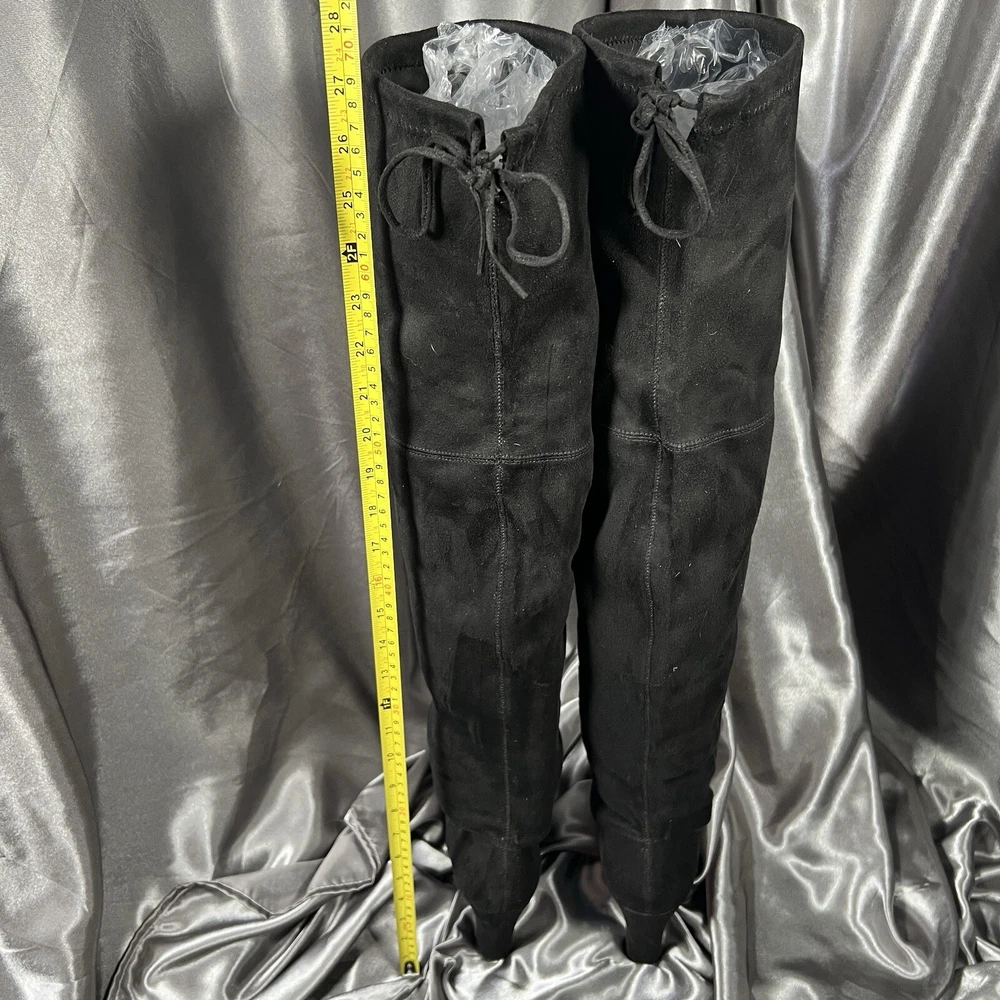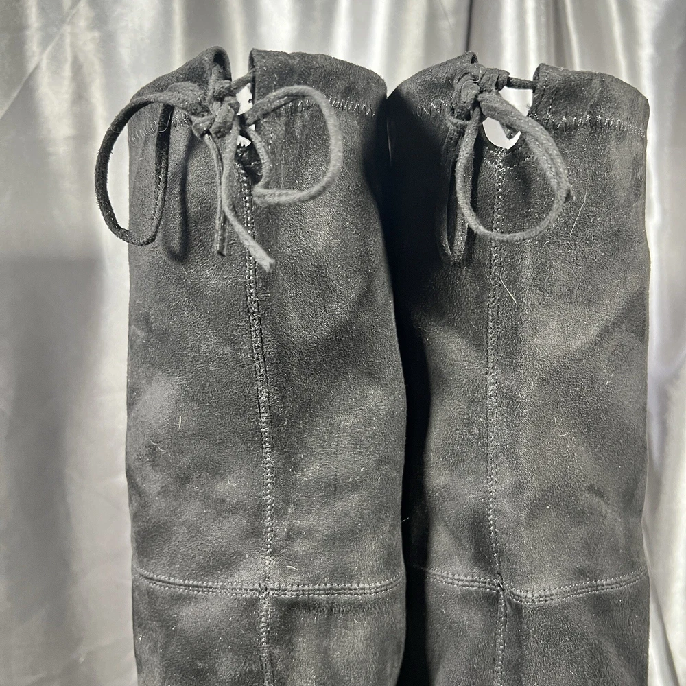 Department: Women Occasion: Casual Vintage: No Product Line: Gorgeous by Steve Madden Pattern: Solid Toe Shape: Almond Toe Model: Steve Madden Gorgeous Upper Material: Faux Suede Insole Material: Synthetic US Shoe Size: 8.5 Type: Boot Color: Black Brand: Steve Madden Seller Notes: “Condition shown in photos & video ❤️‍ 🙂” UK Shoe Size: 7 Theme: Christmas, Clubwear, College, Going Out, School, OF, Fall, Date Night, New Year's Eve, Party, Sexy EU Shoe Size: 39 Outsole Material: Synthetic Heel Height: Ultra High (4 in & Higher) Shoe Shaft Style: Over the Knee Calf Width: Regular Shoe Width: M Style: Slip-On Closure: Pull On Heel Style: Block Lining Material: Leather Character: Boots Accents: Ties Season: Fall, Winter