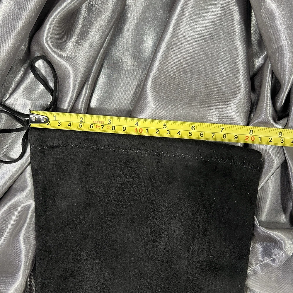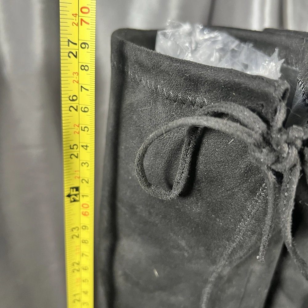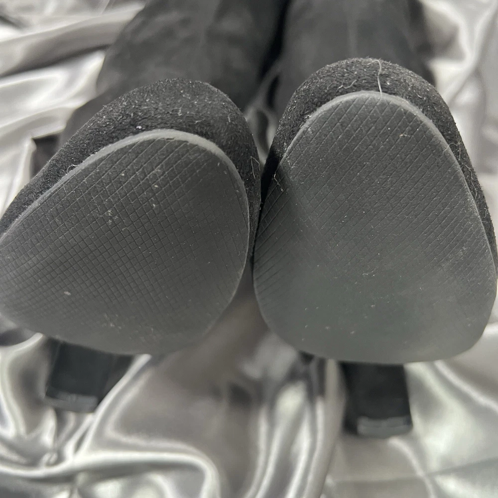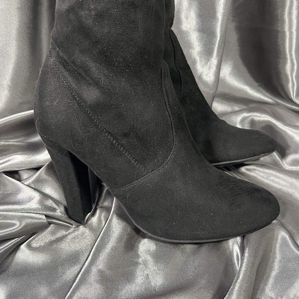 Department: Women Occasion: Casual Vintage: No Product Line: Gorgeous by Steve Madden Pattern: Solid Toe Shape: Almond Toe Model: Steve Madden Gorgeous Upper Material: Faux Suede Insole Material: Synthetic US Shoe Size: 8.5 Type: Boot Color: Black Brand: Steve Madden Seller Notes: “Condition shown in photos & video ❤️‍ 🙂” UK Shoe Size: 7 Theme: Christmas, Clubwear, College, Going Out, School, OF, Fall, Date Night, New Year's Eve, Party, Sexy EU Shoe Size: 39 Outsole Material: Synthetic Heel Height: Ultra High (4 in & Higher) Shoe Shaft Style: Over the Knee Calf Width: Regular Shoe Width: M Style: Slip-On Closure: Pull On Heel Style: Block Lining Material: Leather Character: Boots Accents: Ties Season: Fall, Winter