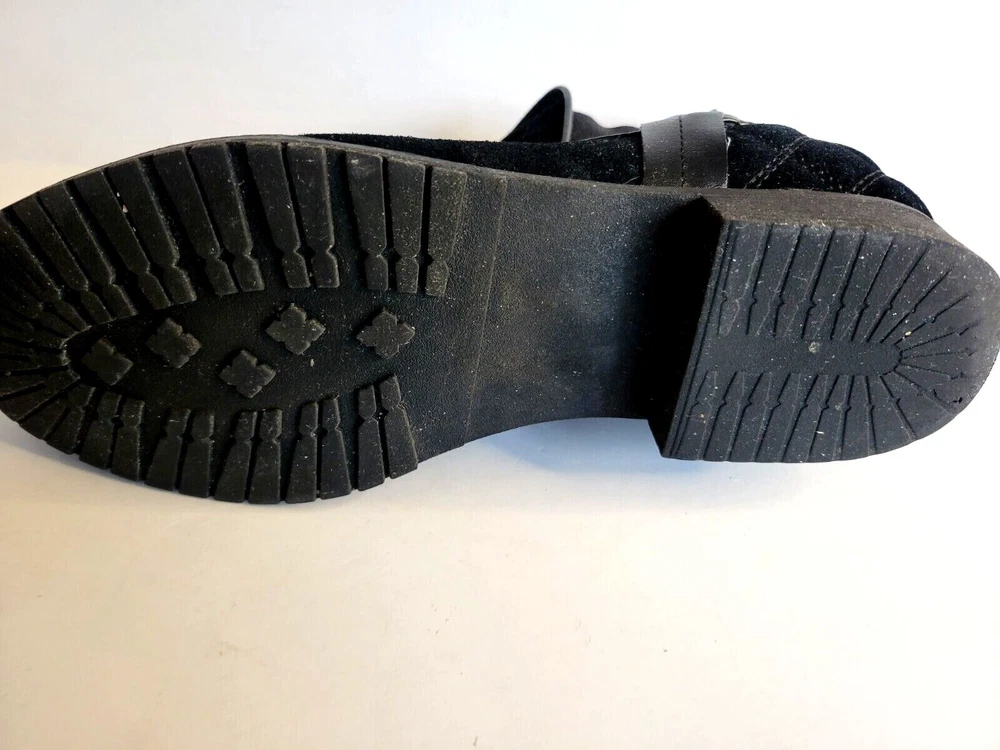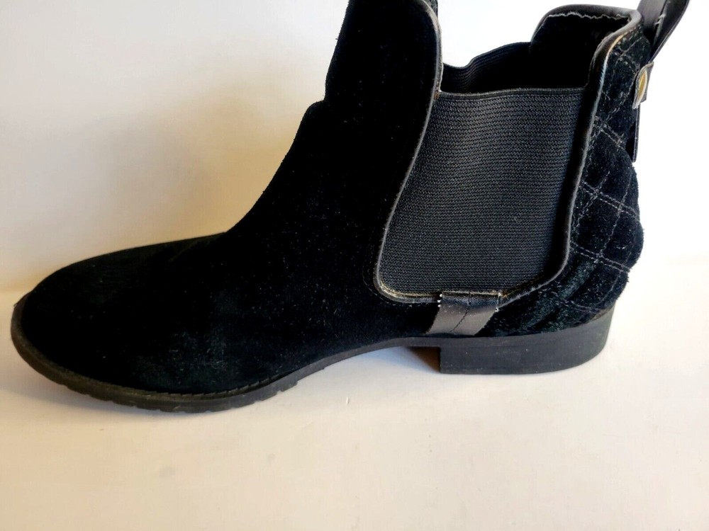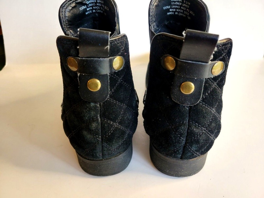Steve Madden "Gianna" black suede leather bootie. Slip on with stretchy sides and pointed toes. Pull on tabs in back with rivet accents. 1/2 inch block heal. Very nice condition with little sign of wear.