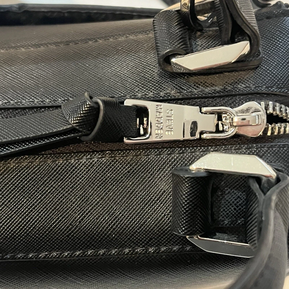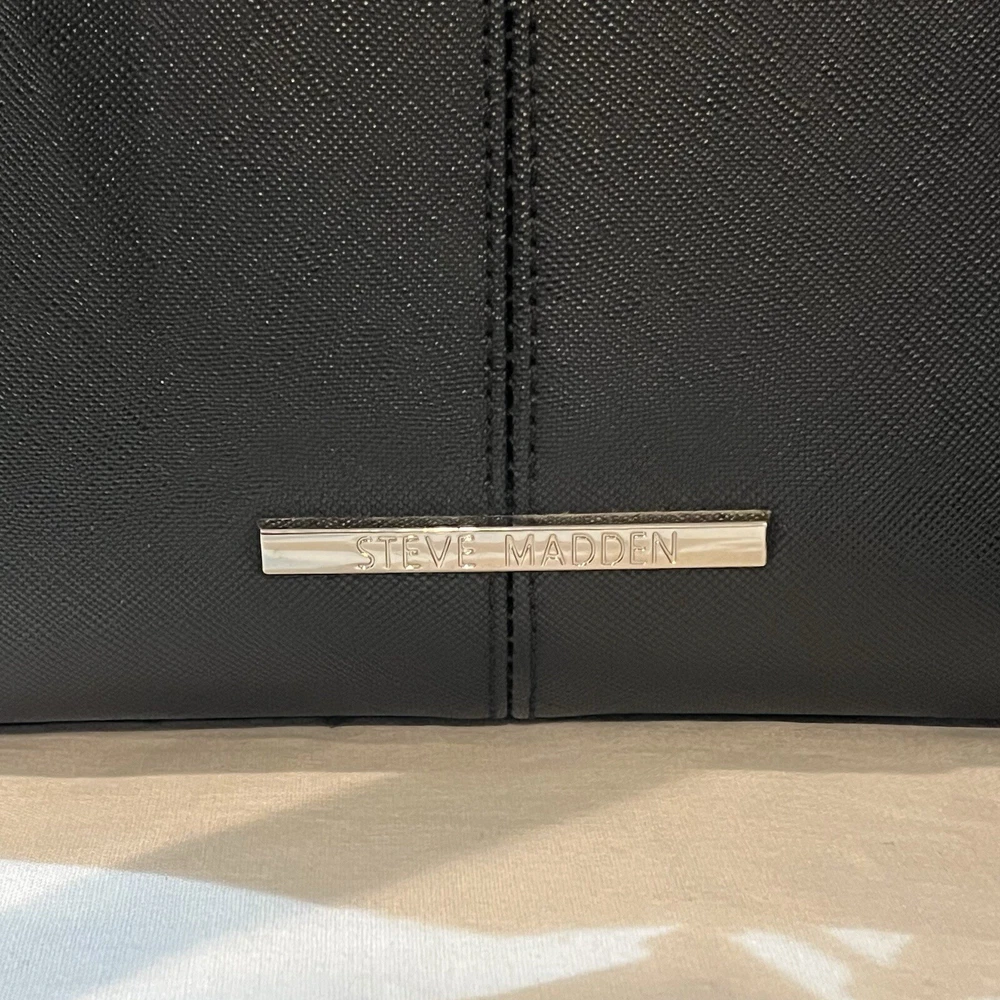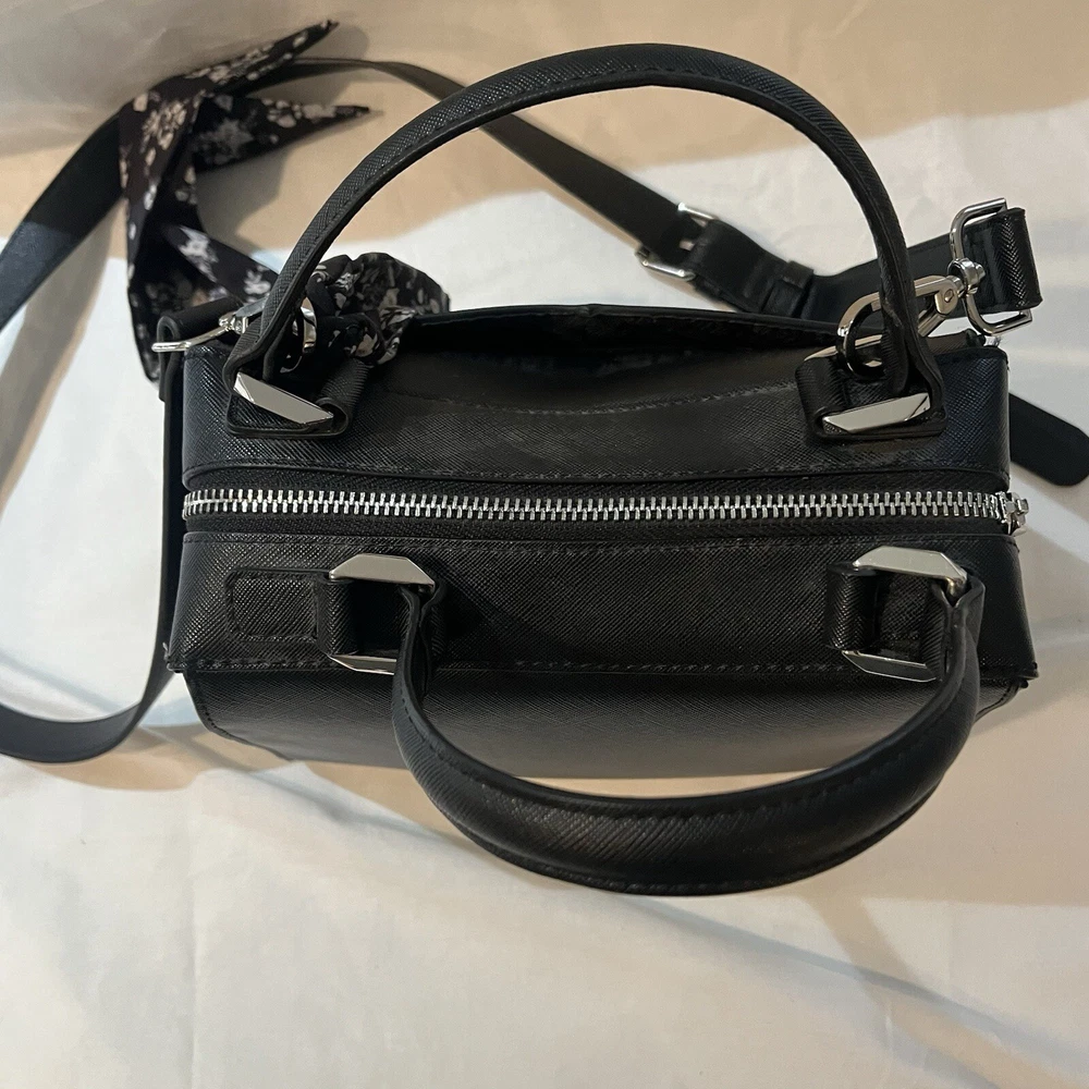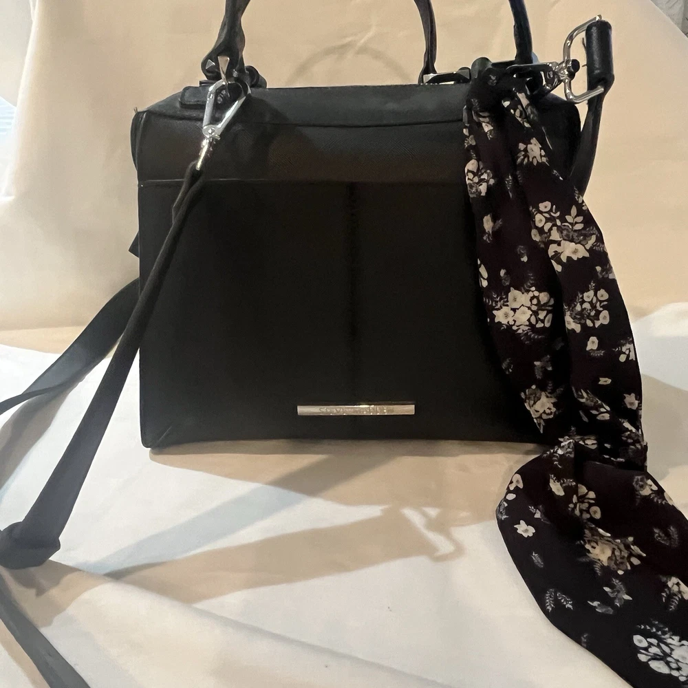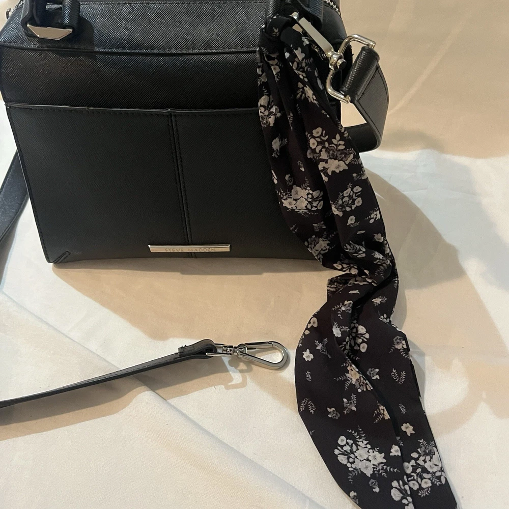 This is a black Steve Madden handbag with a scarf accent and a removable strap. The bag has a square shape and a zip closure. It is 8”H, 9”W, and 4.5”D in size and has double handles with a removable shoulder strap. The lining is black fabric, and the hardware color is silver. The bag is made of polyester cloth and has accents including a strap, bow, zipper, and logo. It is a small satchel, crossbody, and handbag in style and has features such as being lined, having inner pockets, and being adjustable.