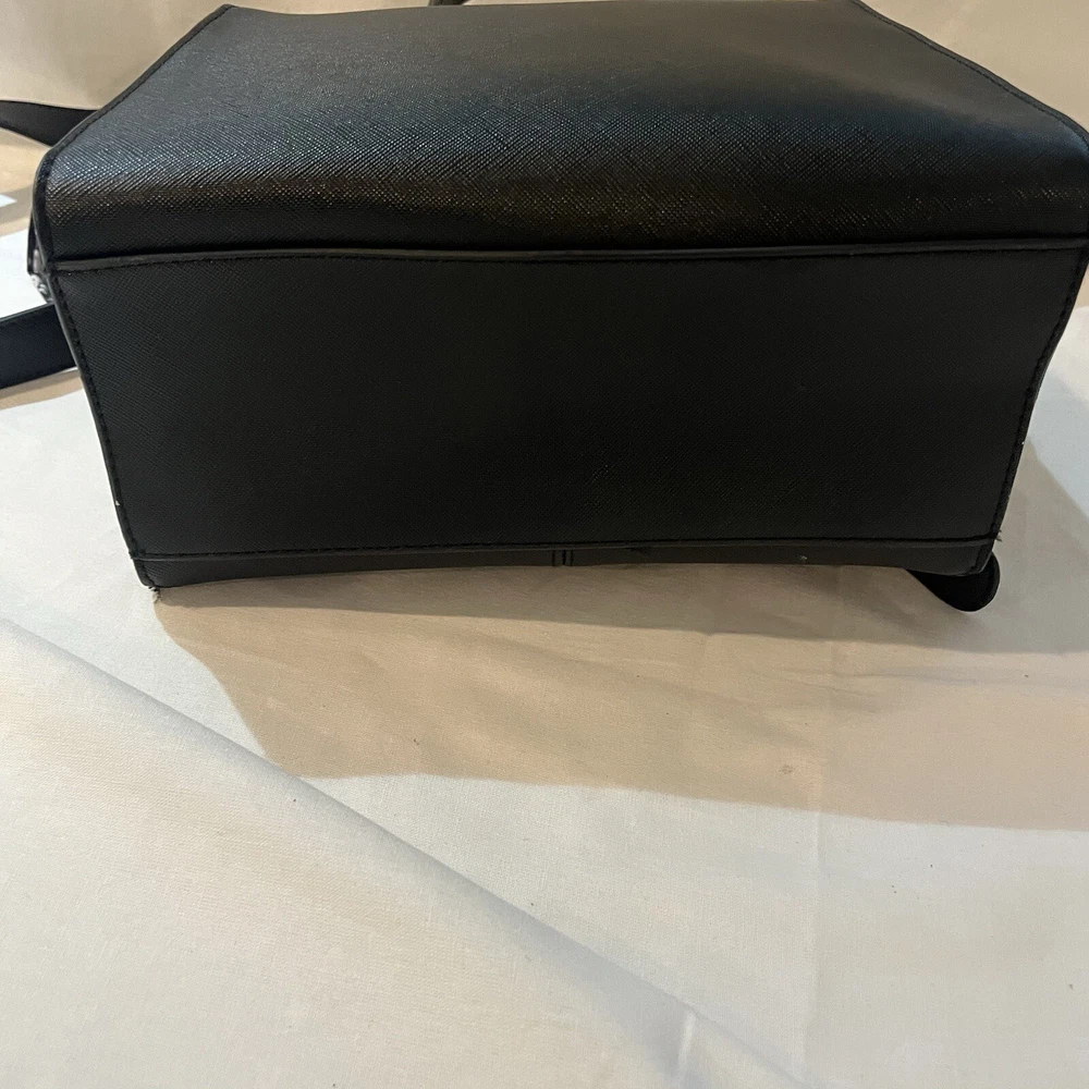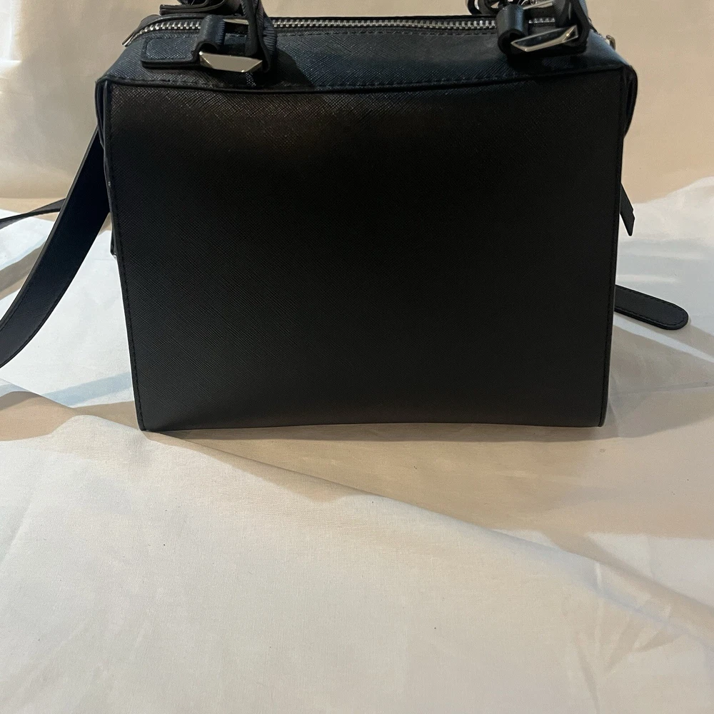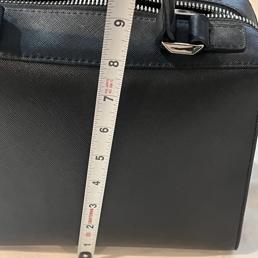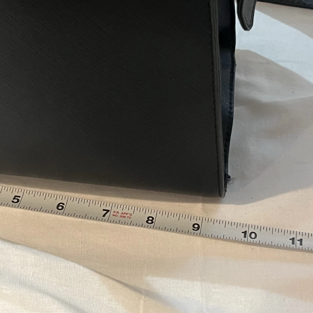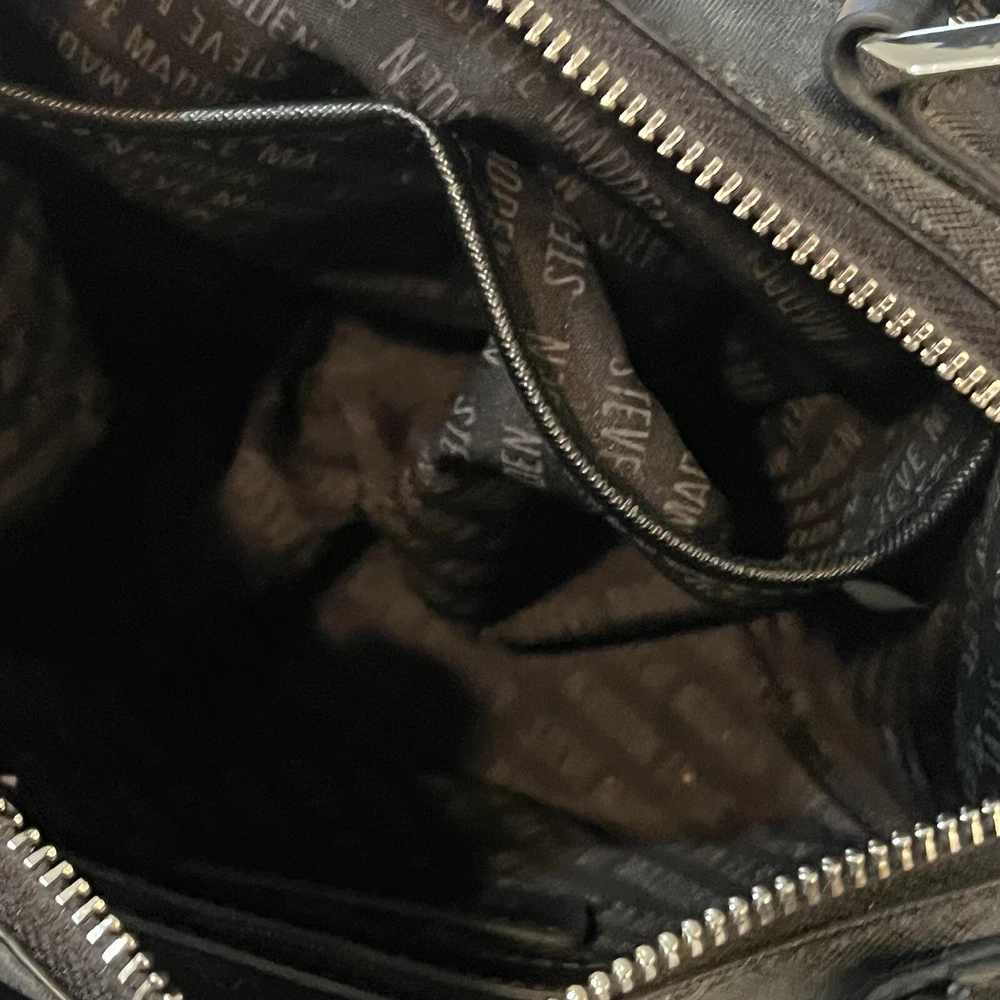 This is a black Steve Madden handbag with a scarf accent and a removable strap. The bag has a square shape and a zip closure. It is 8”H, 9”W, and 4.5”D in size and has double handles with a removable shoulder strap. The lining is black fabric, and the hardware color is silver. The bag is made of polyester cloth and has accents including a strap, bow, zipper, and logo. It is a small satchel, crossbody, and handbag in style and has features such as being lined, having inner pockets, and being adjustable.