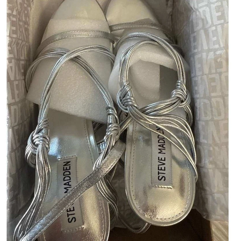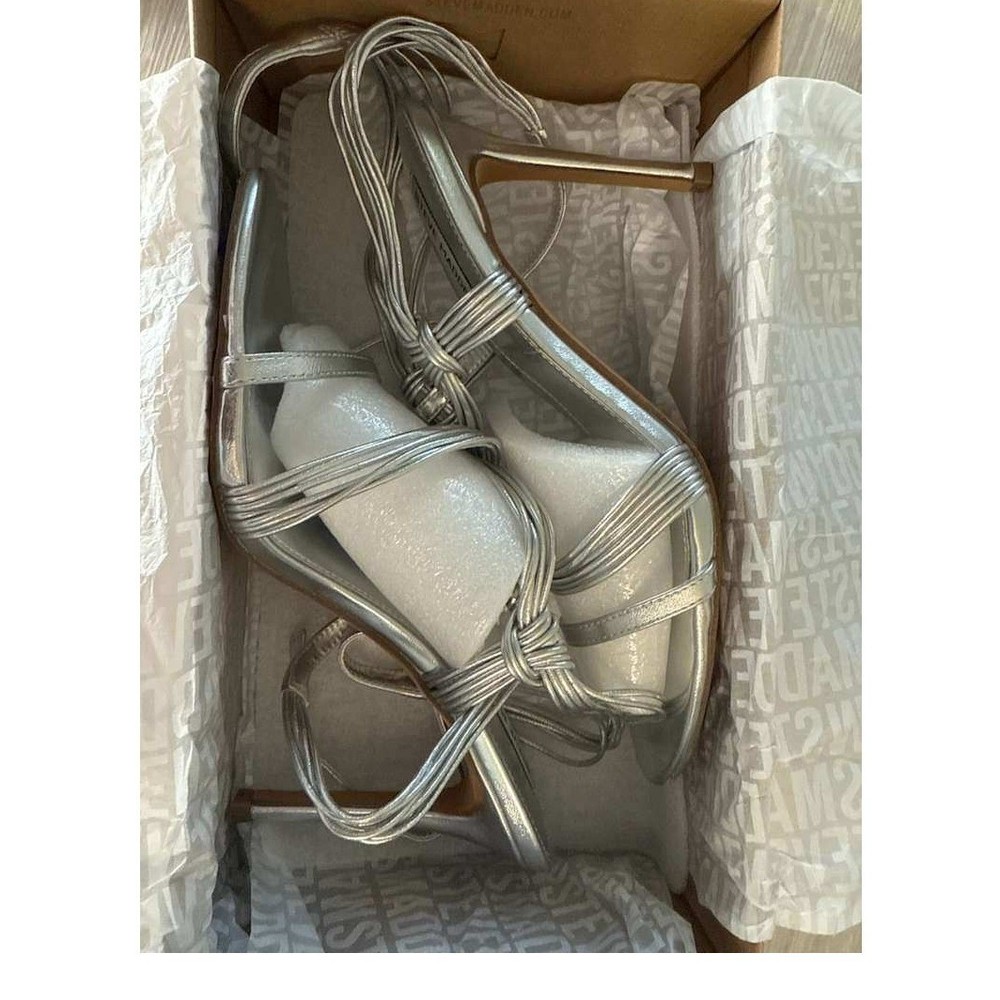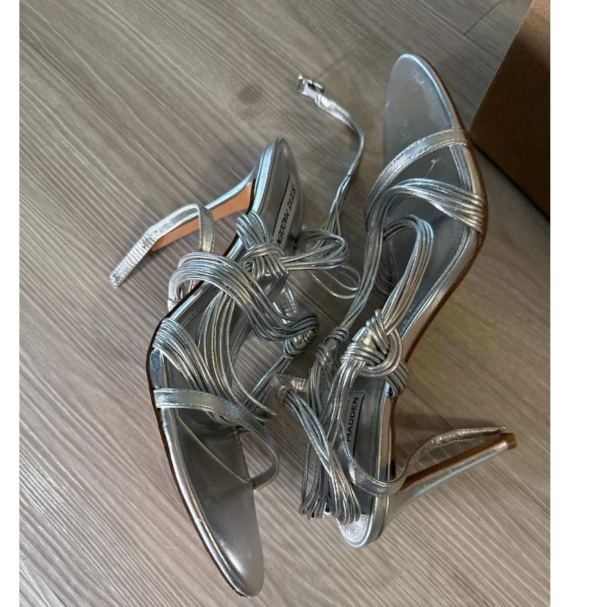 US Shoe Size: 10 Personalize: No Features: Adjustable Strap, Straps, Ankle Strap, Comfort Pattern: Solid Heel Style: Stiletto Theme: Metal Season: Summer, Spring Vintage: No Character: Steve Product Line: Steve Madden LELE Outsole Material: Rubber UK Shoe Size: 7.5 Closure: Tie AU Shoe Size: 9 Department: Women Lining Material: Leather Heel Height: High (3-3.9 in) Accents: Logo Country of Origin: China Upper Material: Synthetic Customized: No Style: Strappy Type: Sandal Shoe Width: Standard Insole Material: Leather Brand: Steve Madden EU Shoe Size: 41 Occasion: Party/Cocktail Color: Silver Model: LELE