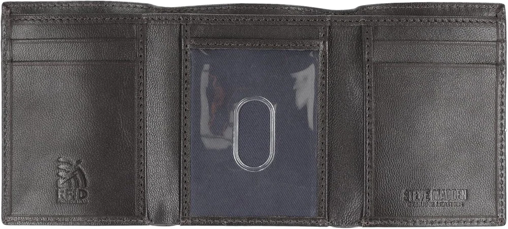 100% GENUINE LEATHER WALLET - This men's leather trifold wallet with RFID technology is crafted from genuine leather that is buttery soft to the touch, as well as extremely durable and perfect for daily use. RFID-Blocking Technology - Protect yourself from identity theft and electronic pickpocketing by upgrading your wallet to a new genuine leather RFID credit card protector. SLIM AND SMART DESIGN - This slim RFID leather trifold folds twice and is compact enough to fit easily in your pocket. Featuring 4 card slots, 3 additional pockets, and a mesh ID slot, the wearer will never be short on storage. SLEEK AND SOPHISTICATED - This slim men's trifold leather wallet is functional, sleek and sophisticated: The wallet features a mesh slot for easy access to your personal ID, and RFID blocking technology, to protect sensitive information. STEVE MADDEN QUALITY & FUNCTION - We stand by our product and believe you will too. Our STEVE MADDEN Men's fashionable leather trifold wallet with RFID technology is the best wallet for all occasions and combines durability and fashion. STEVE MADDEN GENUINE LEATHER RFID WALLET - A genuine leather slim compact trifold wallet with RFID technology, featuring 6 credit card slots, 3 additional pockets underneath the credit card slots, a clear ID slot, two cash pockets and an emBOSSed STEVE MADDEN logo.