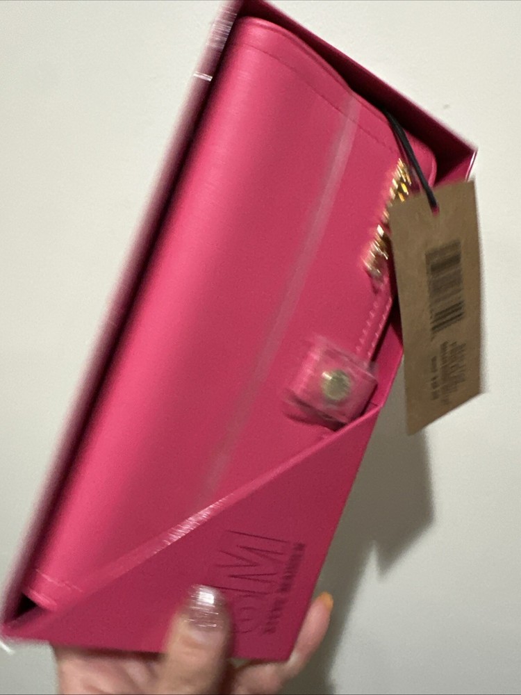 This Steve Madden women's wallet has fabulous retro style, featuring a bright pink color with a neon flash design. The wallet is a button close type, crafted from faux leather material, and includes credit card slots and a folding design. With a small size suited for on-the-go use, this wallet exudes a playful and vibrant aesthetic perfect for adding a pop of color to any outfit.