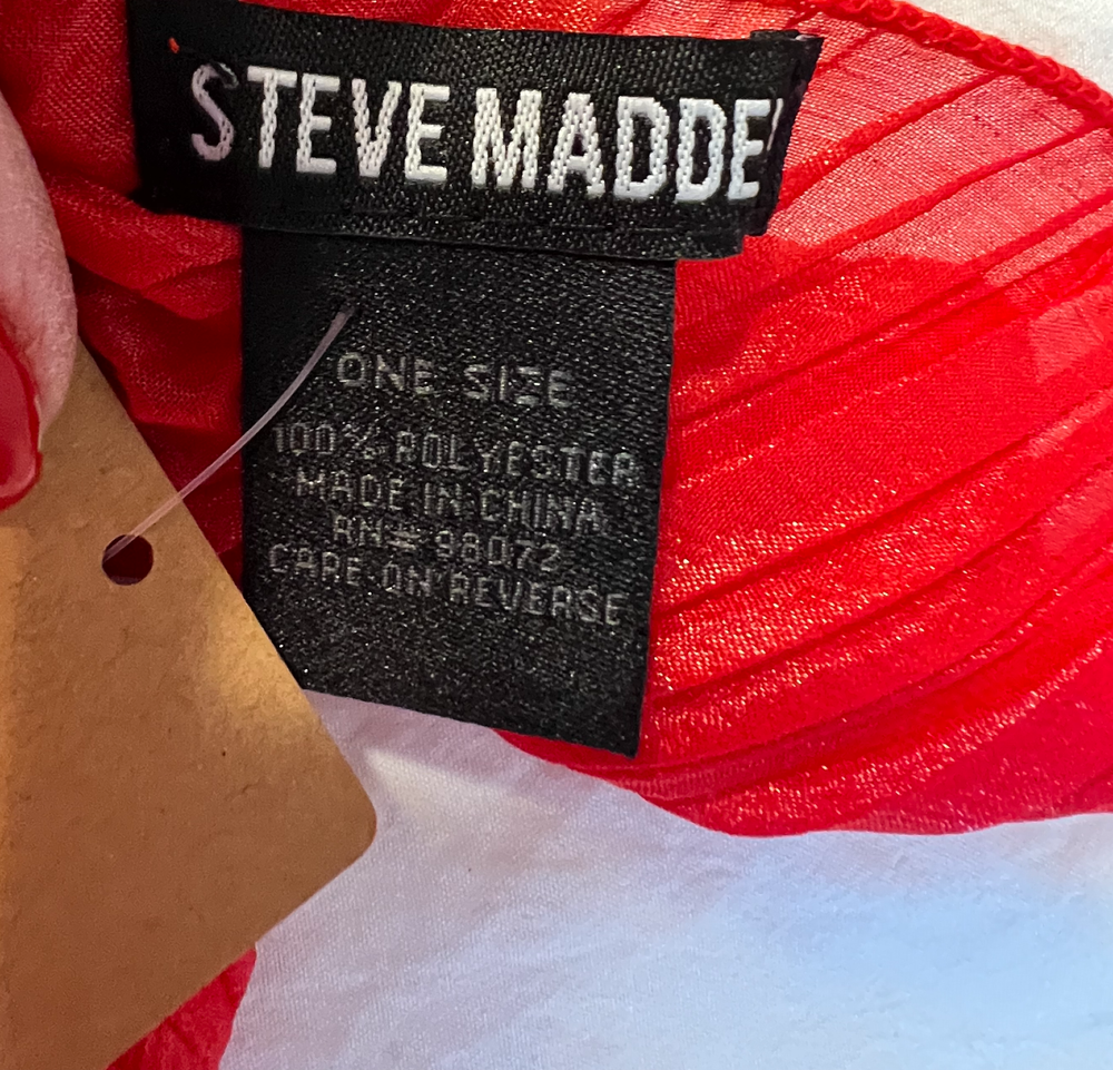 NEW WITH TAGS | $32 retail 66" length 22" width This Steve Madden scarf is a red rectangle scarf made of polyester, measuring 22 inches wide and 66 inches long. It features a scallop hem and can be worn as a scarf, cover-up, or sarong. It is versatile for different occasions and seasons. It is machine washable and suitable for women's accessories. ** all items stored in smoke-free, pet-free home