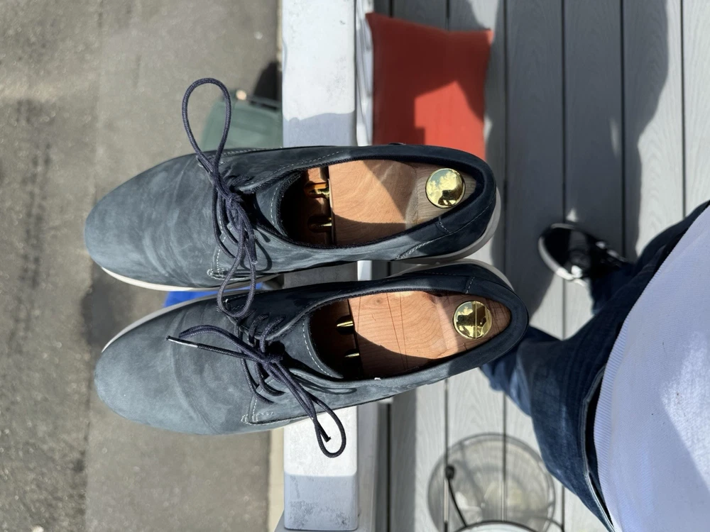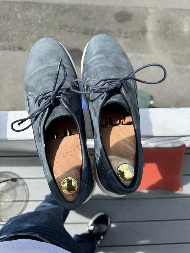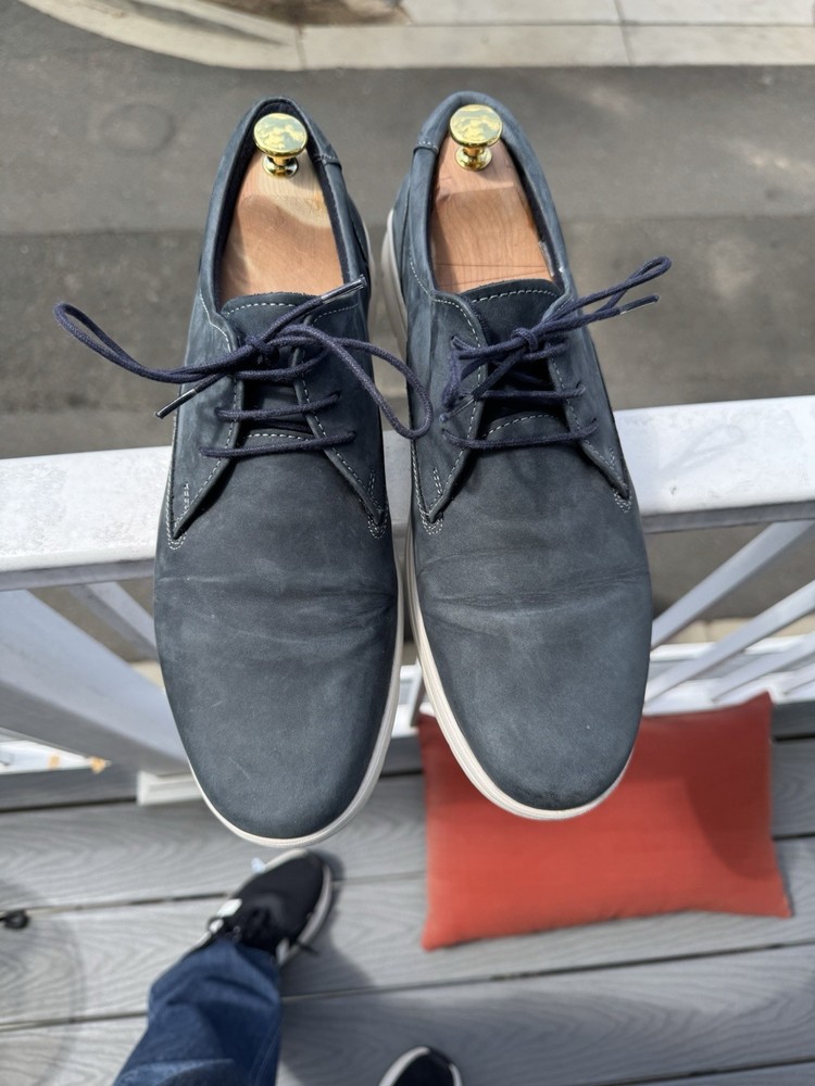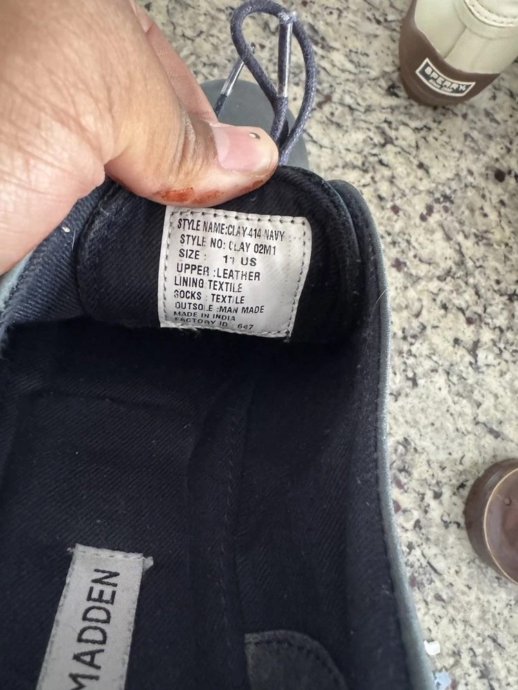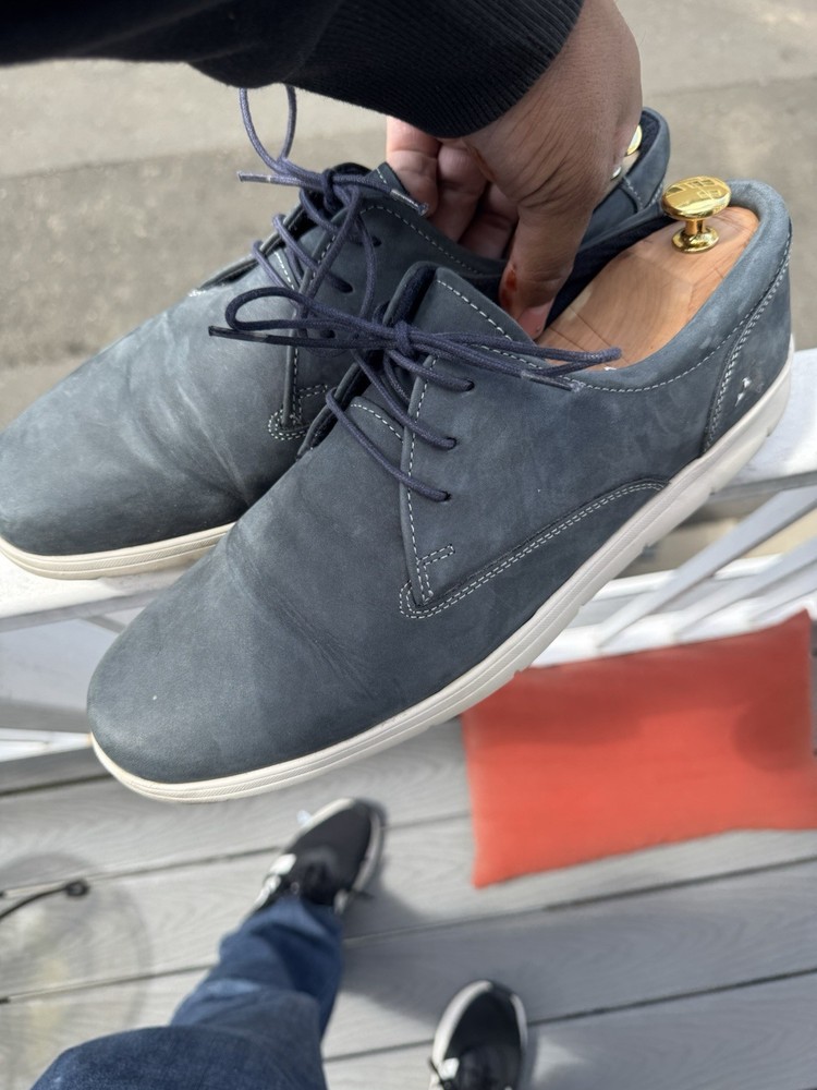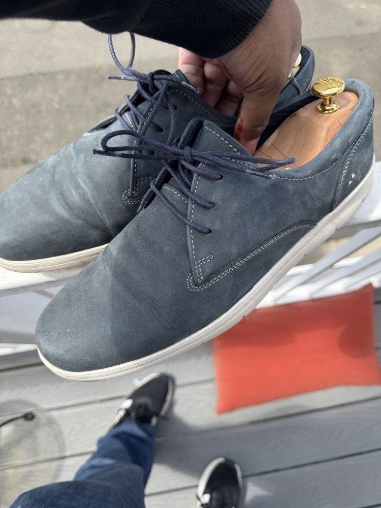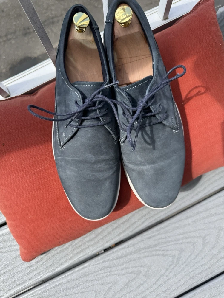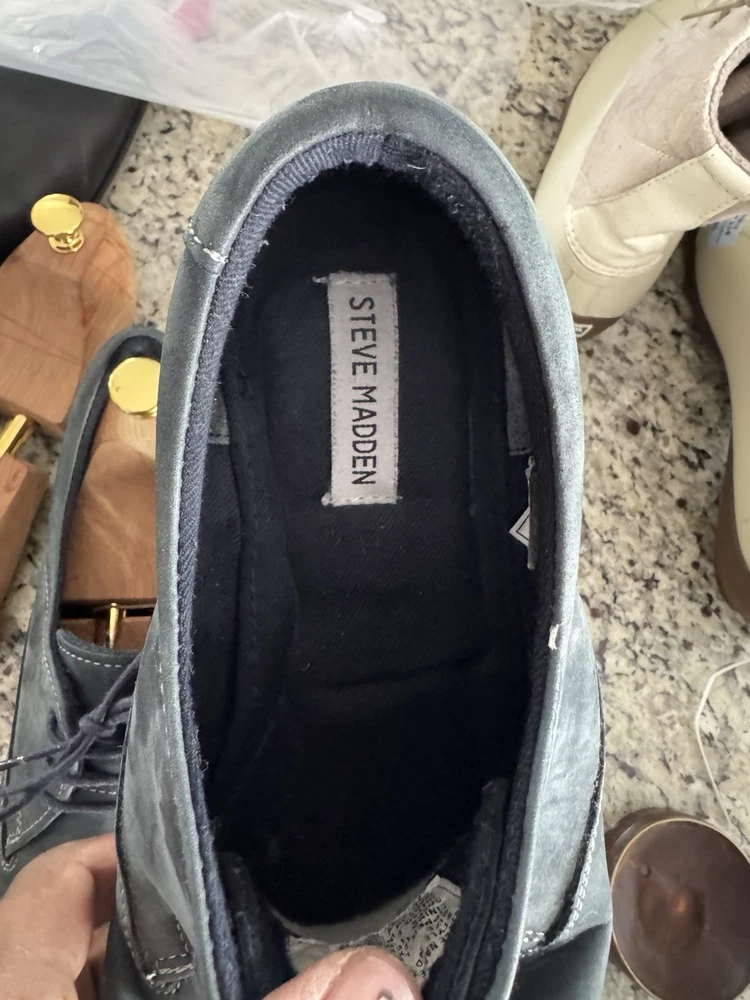 The product is a pair of Steve Madden men's navy blue leather lace-up oxfords in size 11. These casual shoes feature a classic oxford style with a medium width and leather material for both the upper and outsole. The lace-up closure adds a stylish touch to the shoes, making them a versatile option for everyday wear. The navy blue color adds a pop of color to any outfit, making these shoes a practical and fashionable choice for men looking for a quality pair of shoes. NOTE: Shoe Trees NOT Icluded!