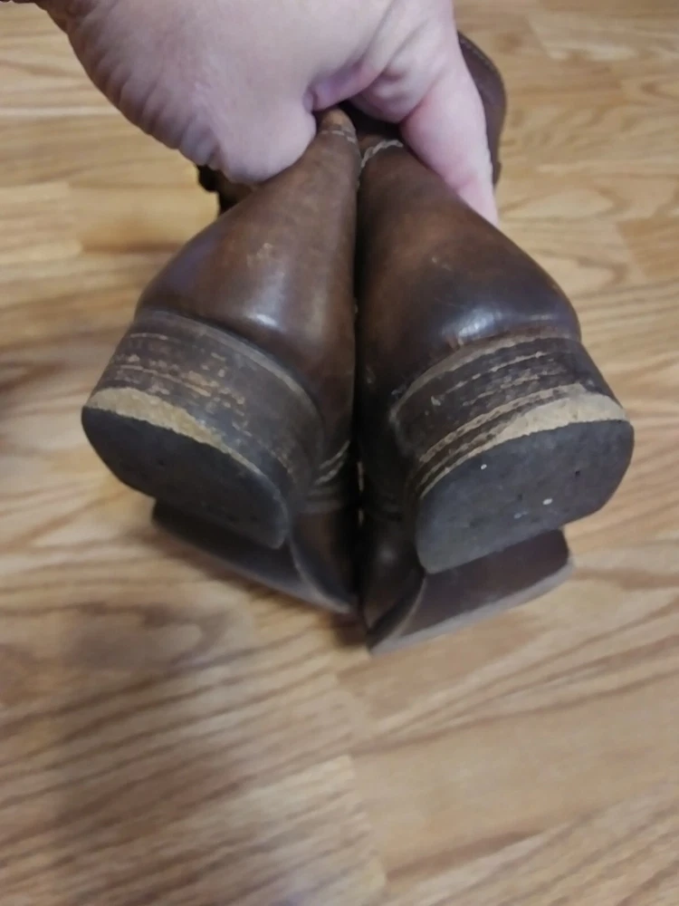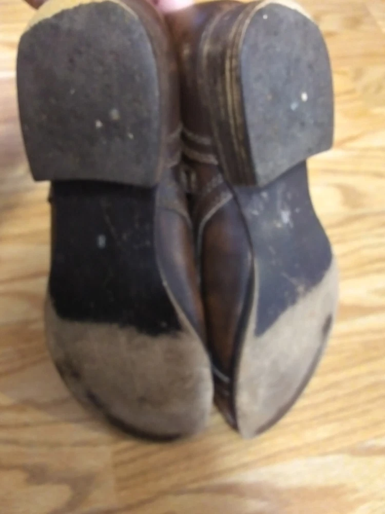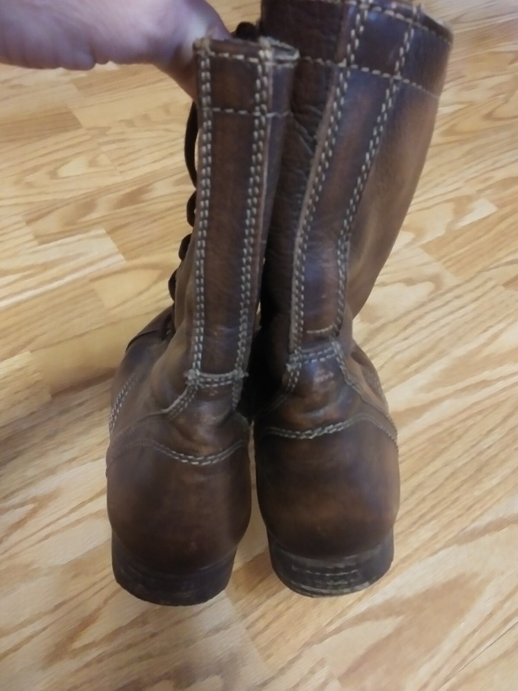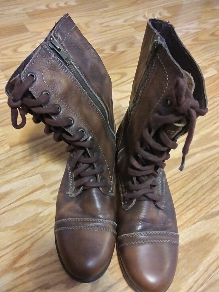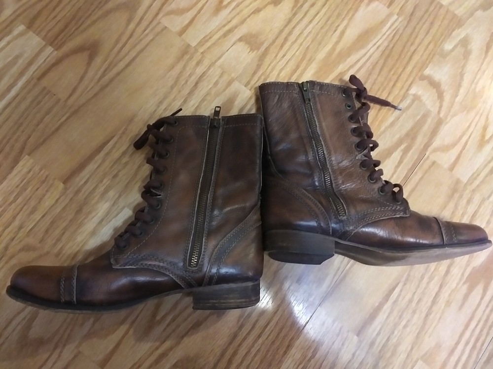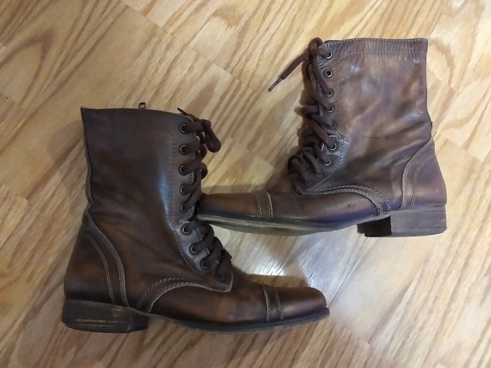 1. Just got these Steve Madden Troopa boots and they're amazing! The brown leather is still rich and stylish, with only minor wear on the soles—super comfy and broken in perfectly. Sadly, they run a little narrow for my wide feet, but otherwise they look and feel fantastic. Check the pics for details, but overall a great find in great condition!