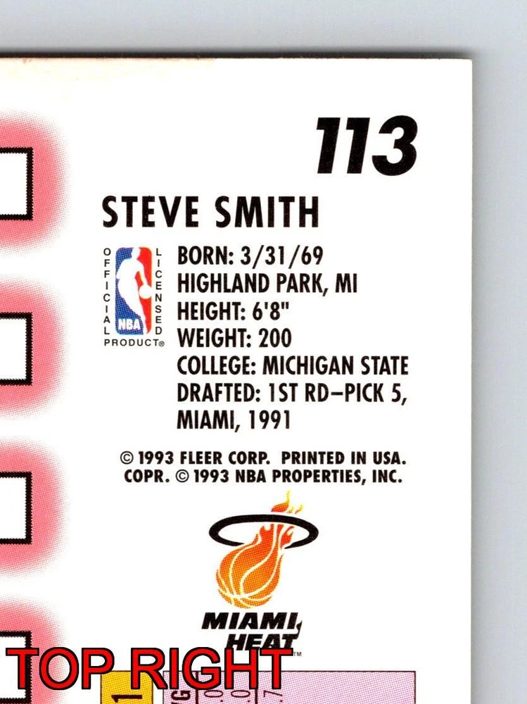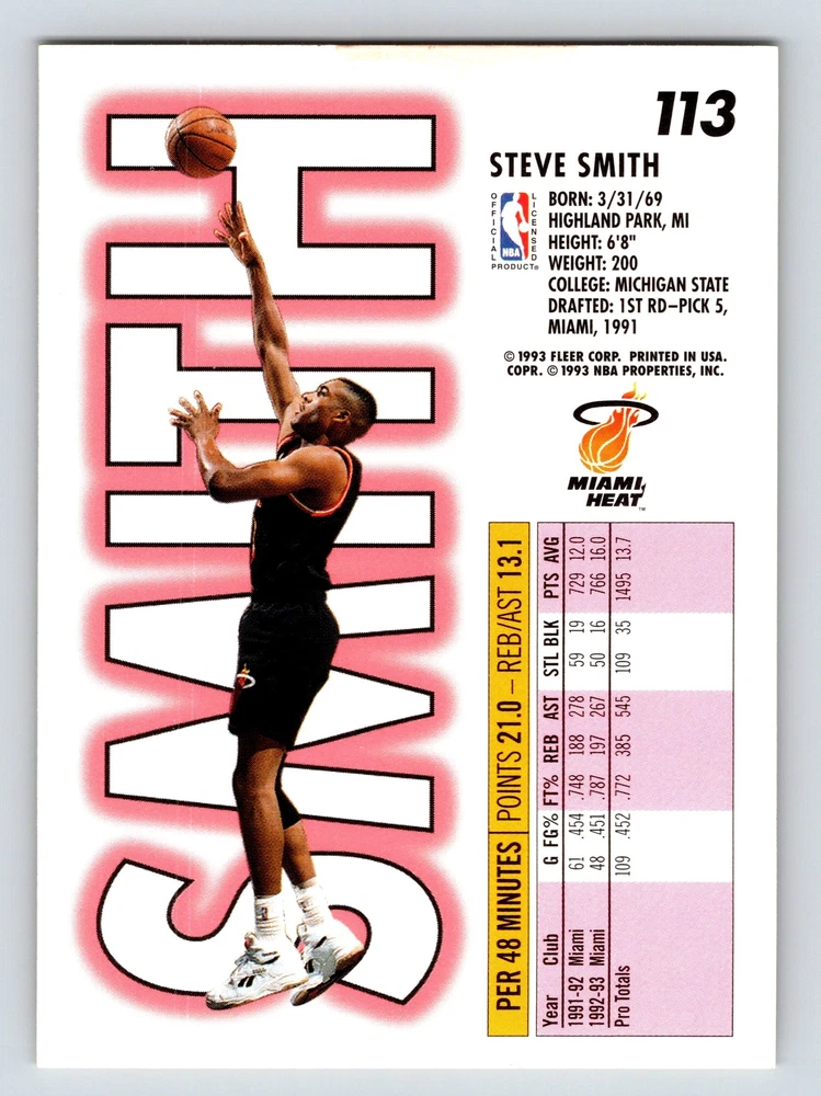 Item Description Title: Steve Smith Miami Heat Guard Fleer 199394 Card 113 Basketball Memorabilia Description: This sports trading card features Steve Smith, a talented guard for the Miami Heat. Part of the Fleer 1993-94 series, this card captures Smith during his dynamic play style and showcases his prowess on the court. Standing tall at 6'8 and weighing 200 lbs, Smith exhibits the physical attributes that made him an asset to his team. Born on March 31, 1969, in Highland Park, MI, and a Michigan State alumnus, he was the 5th pick in the 1st round of the 1991 NBA Draft. The front of the card highlights Smith energetically moving with the ball, while the back provides valuable career stats, showing his scoring and rebounding skills. This card is a fine addition for collectors and basketball enthusiasts who appreciate the legacy of early 90s NBA stars. MRSP: $2.99 Sport: Basketball Player/Athlete: Steve Smith Season: 1993-94 Manufacturer: Fleer Parallel/Variety: Unknown Set: Fleer Basketball 1993-94 Team: Miami Heat League: National Basketball Association (NBA) Card Number: 113 Counter: 229 Folder: BASKETBALL1224002
