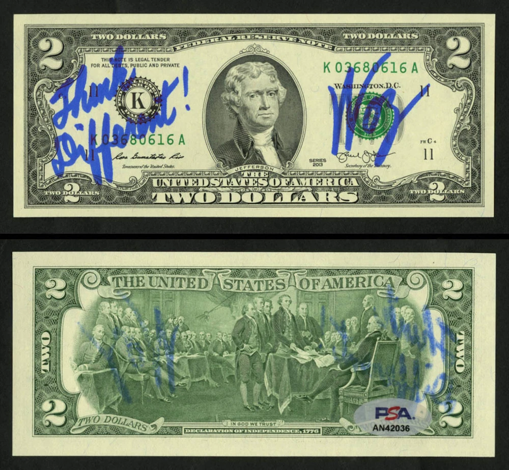 eBay Store SIGNED ACTORS SIGNED ACTRESSES SIGNED BASEBALL SIGNED BASKETBALL SIGNED BOOKS SIGNED CHECKS SIGNED COLLECTIBLE TOYS SIGNED FOOTBALL SIGNED GOLF SIGNED HOCKEY SIGNED HORSE RACING SIGNED INDEX CARDS SIGNED IN THE PRESENCE SIGNED MISCELLANEOUS SIGNED MODELS SIGNED MUSICIANS SIGNED NASCAR SIGNED OLYMPIANS SIGNED ORIGINAL ART SIGNED POSTERS/PRINTS SIGNED ROOKIEBALL/GRAPH eBay Feedback eBay Auctions eBay Me Autographed Item Item Description I have available this 2 Dollar Bill that has been signed by Steve Wozniak. Mr. Wozniak signed this Two Dollar Bill for me IN PERSON and he added "Think Different!" with his signature. The $2 Bill is in brand new unused condition, no dents, dings or tears and would make a great addition to any Apple fans collection. The signature has been authenticated by PSA/DNA and the PSA/DNA certification number for this bill is: AN42036 Similar Items Please click the button below to view our other auctions which are similar to this item. Search Payment Details We gladly accept PayPal for all payments. Payment for your item is expected within 5 days of placing your order. Shipping Details Domestic/International orders: All packages will be shipped out within 1 business day via the United States Postal Service. A tracking number will also be provided. Insurance for your package is optional, but always advised. Please note: International shipping may be subject to import duties and taxes. These charges are not included in the item price or shipping charges. Customers are responsible for these charges. For an estimate of these charges, we suggest you contact your local post office or local government. Additional Information Professional Sports Authenticator (PSA or PSA/DNA) has authenticated and certified the autograph(s) on the item. You can check certification on this item through their website database at PSAcard.com The image(s) of the signed item is the exact item you will receive. We do not use a stock image in any of our auction listings. Signing images are not included in any of our auctions.