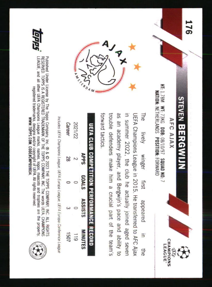 Year Manufactured: 2022 Team: AFC Ajax Type: Sports Trading Card Card Number: 176 Graded: No Season: 2022 Player|Athlete: Steven Bergwijn Autographed: No Set: 2022-23 Topps UEFA Club Competitions Manufacturer: Topps Sport: SOCCER