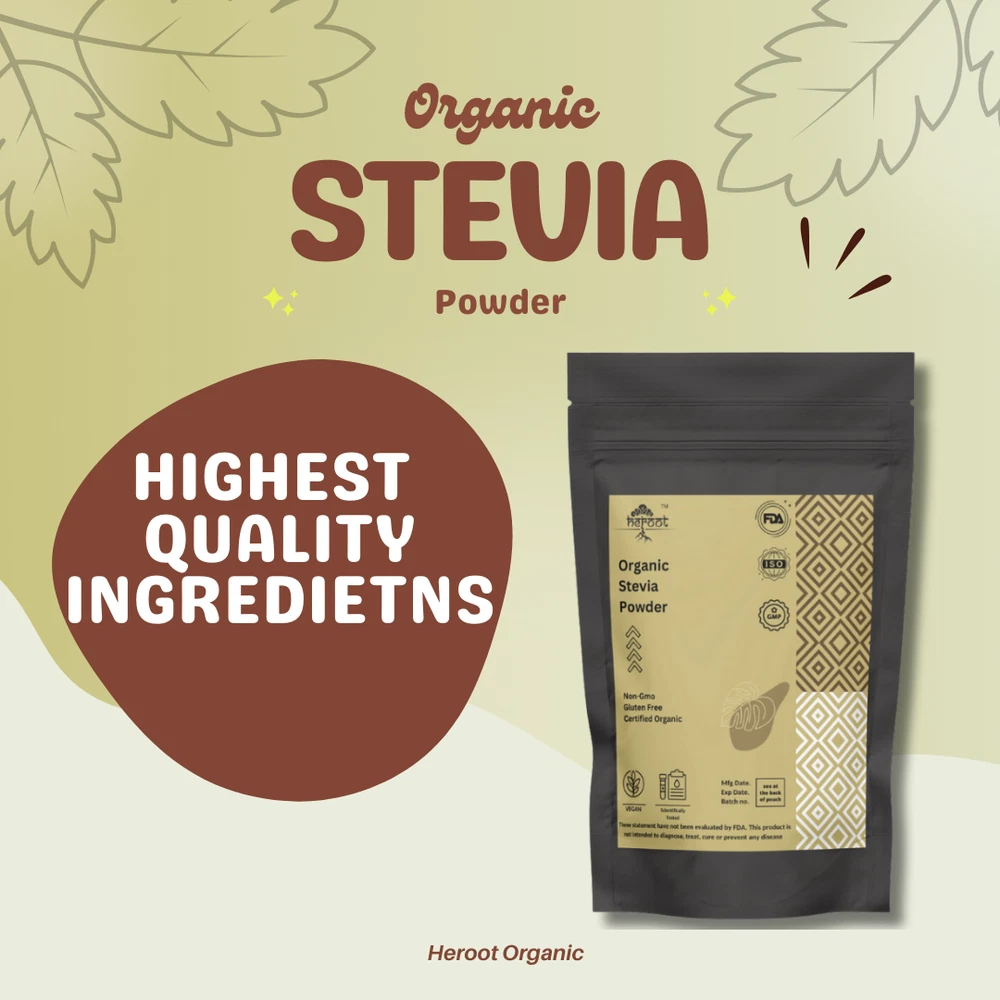 Heroot Organic Stevia Powder A natural and healthful alternative to traditional sugar. Derived from the Stevia plant, this powder serves as a non-nutritive sweetener and herbal supplement, providing a delightful sweetness without the calories associated with added sugars. Stevia Leaf Powder offers a guilt-free way to enhance the flavor of your favorite meals and beverages. With its naturally sweet taste, it can be used as a substitute for sugar in various recipes, including beverages, desserts, and baked goods. Whether you're preparing a refreshing drink or indulging in a sweet treat, Stevia Leaf Powder allows you to enjoy the sweetness you crave without compromising your health. What sets Stevia Leaf Powder apart is its low calorie content. As a non-nutritive sweetener, it contains minimal calories, making it an excellent choice for individuals who are conscious of their caloric intake. By incorporating Stevia Leaf Powder into your daily routine, you can reduce your consumption of added sugars while still satisfying your sweet tooth. Aside from its sweetening properties, Stevia Leaf Powder is also recognized as an herbal supplement. It has been used for centuries in traditional medicine for its potential health benefits. While more research is needed to fully understand its effects, some studies suggest that Stevia may have antioxidant and anti-inflammatory properties, making it a potentially valuable addition to your wellness routine. Key Ingredients: Stevia leaf powder Key Benefits Weight control Blood pressure Diabetes pancreatic cancer Allergies Childrens diets Directions For Use: Consume 2gm with lukewarm water after a meal Or as directed by your healthcare provider How To Consume: Can be mixed with warm milk & honey Can be taken with juices & smoothies Can be taken directly with honey Can be filled in capsule and consumed with water Safety Information: Store in a cool dry place Keep out of reach of children If you are pregnant or lactating or prone to any food allergy or under any medical condition consult your healthcare practitioner before use Disclaimer The above description is for information and knowledge purpose, not a healthcare professional advice. Please consult your doctor and/or pharmacist before you take this vitamin. Pregnant or lactating women, diabetics, hypoglycemics, and people with known medical conditions and/or taking drugs, should consult with a licensed physician and/or pharmacist prior to starting any supplementation program. The above statements have not been evaluated by the Food & Drug Administration. Shipping and Handling Shipping time will be 1 business day after the cleared payment We will ship by Indian Post service Shipment will take 15-30 days. Few more days for your local customs delay and formalities. For Express service additional charges will be applied. For any reason you wish to leave Negative or neutral feedback, Please contact us first and let us mutually resolve it. We care for your satisfaction and will make sure that you are happy with the transaction to post us 5**** ratings in all areas. ***Customs Information*** Heroot will not be liable for packages refused or held by customs for delivery. We request that you contact customs office and ask about import regulations and restrictions before placing your order. It is importsnt for you to become familiar with customs policies for your specific country before ordering. Customs regulations differ by country and not knowing their regulations can result in your order incurring high import duties, the delivery being delayed or even returned. Please check with your customs office to see if your country permits the shipment of the products you are planning to order from us and if any additional licenses or permits are needed. Please note: if your order is returned to us due to banned/ restricted products policy, a wrong address, refusal to pay customs fees, refusal to accept the order or because no one was there to accept the delivery of your order, we will refund your order as follow: you will be refunded the total amount of the order, minus the original shipping charge.