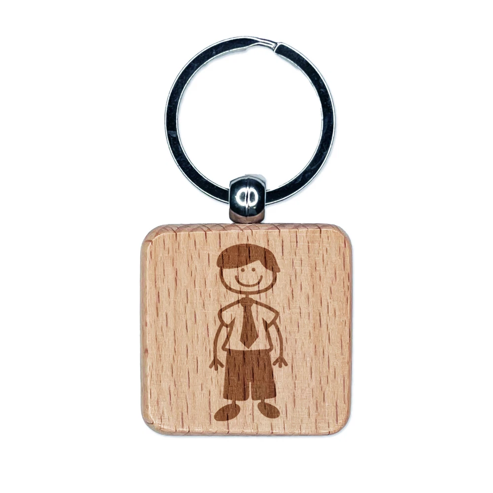 Stick Figure Man Dad Engraved Wood Square Keychain Tag Charm