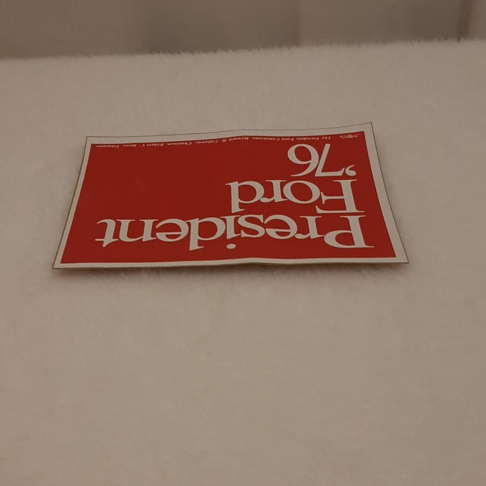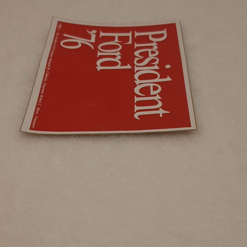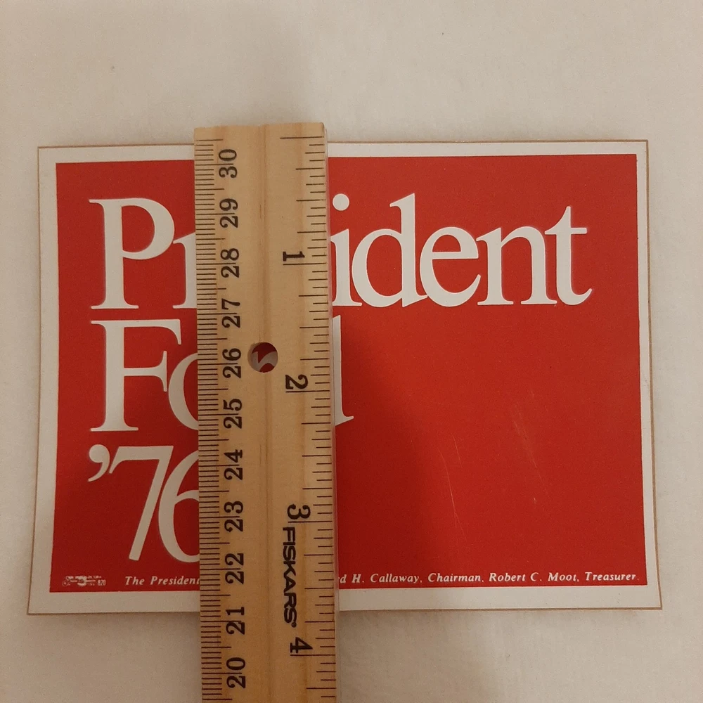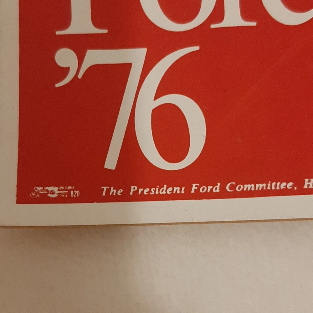 Sticker 1976 President Gerald Ford '76 Campaign Presidential Red & White USA #9 In good pre-owned condition may show signs of wear from use/handling/storage/display. Please view all pics for condition/details/flaws/issues. SOLD AS IS There is marks/spots/dirt/debris please see photos 5-14, there is print loss/paper loss & discoloration please see photos 5-20, there are folds to sticker please see photos 8-20, there is lite separation from sticker to backing please see photos 14-15, there are surface scratches to item please see photos 5-20, please see all photos for condition/issues/details.