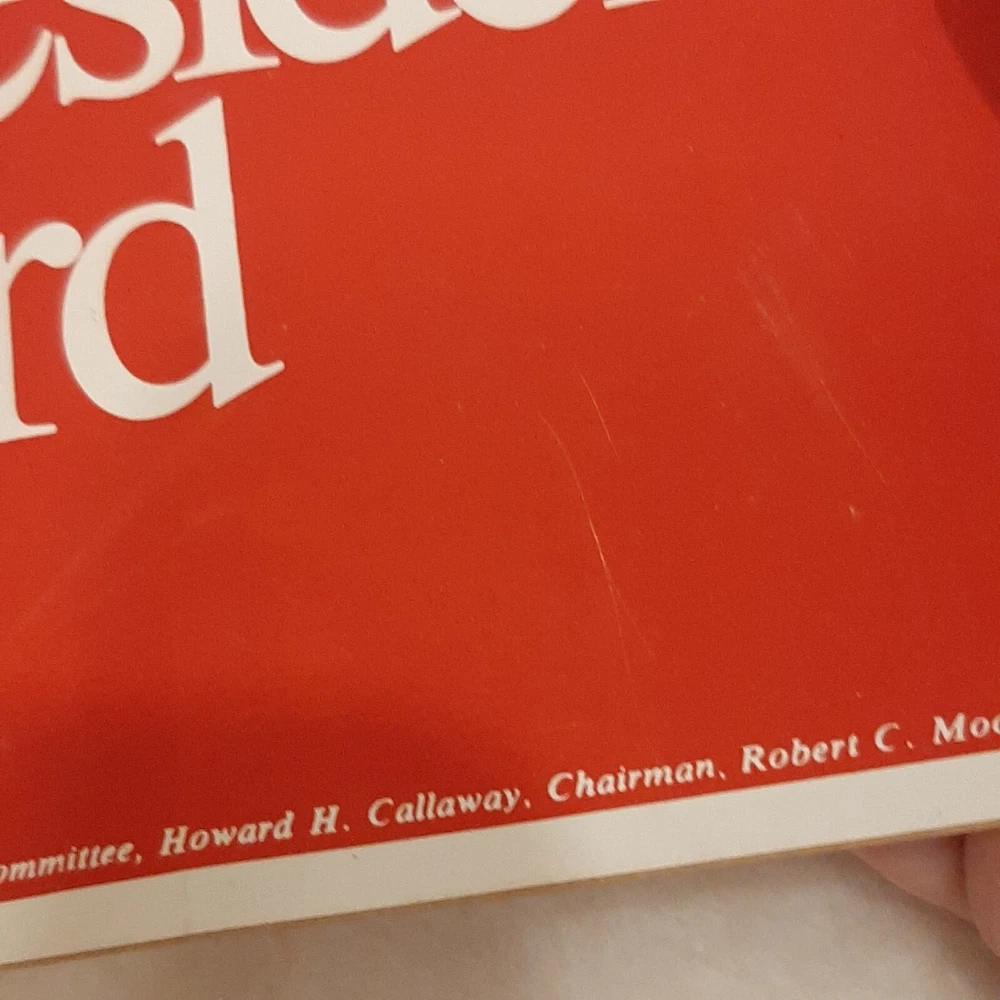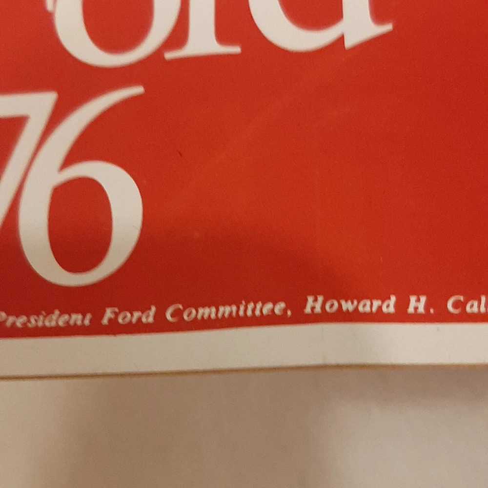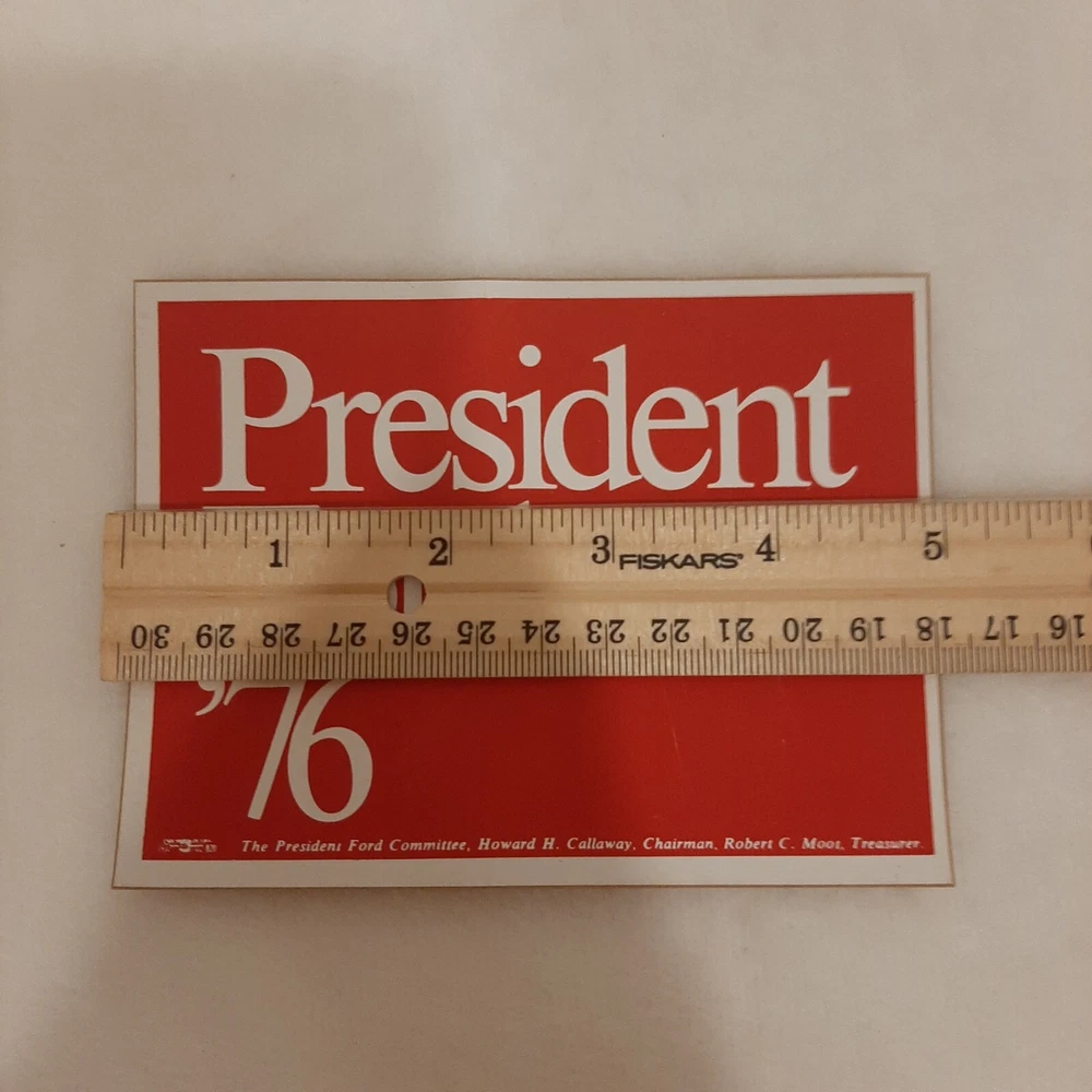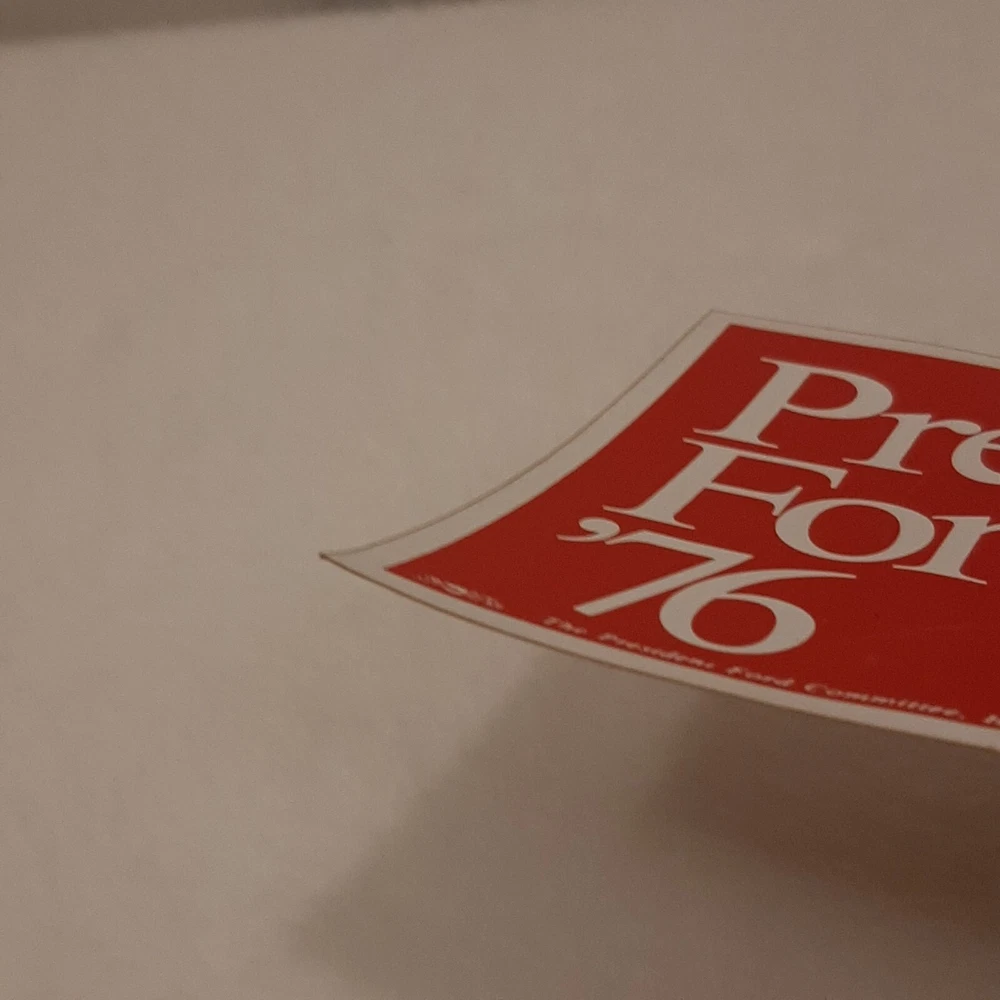 Sticker 1976 President Gerald Ford '76 Campaign Presidential Red & White USA #9 In good pre-owned condition may show signs of wear from use/handling/storage/display. Please view all pics for condition/details/flaws/issues. SOLD AS IS There is marks/spots/dirt/debris please see photos 5-14, there is print loss/paper loss & discoloration please see photos 5-20, there are folds to sticker please see photos 8-20, there is lite separation from sticker to backing please see photos 14-15, there are surface scratches to item please see photos 5-20, please see all photos for condition/issues/details.