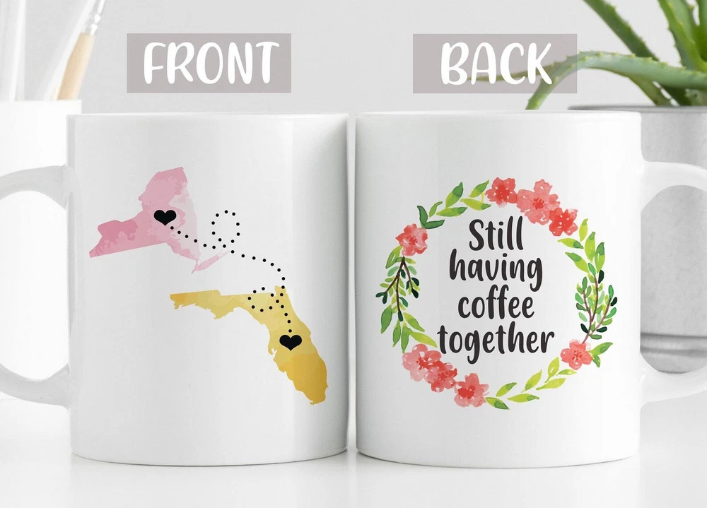 Still Having Coffee Together Mug State To State Mug Moving Away Gift Long Product Details.. This high quality 11oz. ceramic white mug has a premium hard coat that provides crisp and vibrant color reproduction sure to last for years. Perfect for all hot & cold beverages. The highest quality printing possible is used. It will never fade no matter how many times you wash it. Material: 100% Ceramic. Print both sides. Dishwasher and Microwave Safe. High Gloss + Premium White Finish. Printed in the U.S.A. Personalized & Custom. We support personalized and custom mug to add custom, when placing an order, you can add notes to the "order note" in shipping address section. Also you can contact us directly via message. Shipping Info. Ready to ship in 1 to 2 business days, All products are made-to-order and proudly printed in the United States. Shipped by USPS and DHL, You will receive your order in 5-7 days. Replace & Refund. All products are defective during shipping broken, chipped will be replaced free of charge. You are not satisfied with the product, we will refund 100% money to you. If any other issues arise, please do not hesitate to message, we would be more than happy to assist you.