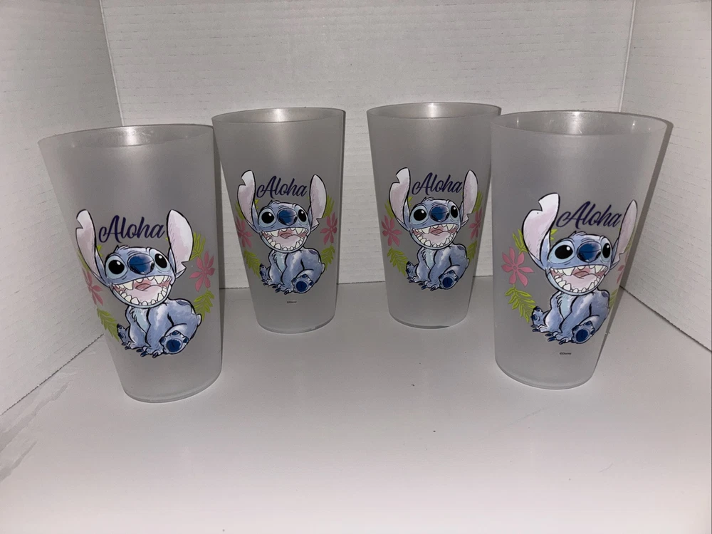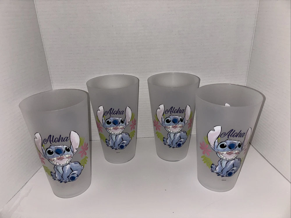 The "Stitch Aloha 32 Ounce Cup(s) - Set Of 4" features four straight-shaped plastic tumbler cups with a 32 oz capacity. Each cup is decorated with a design of Lilo and Stitch characters, specifically featuring Stitch and the theme of Aloha. The cups are dishwasher safe, BPA-free, and stand 7 inches tall. This Disney-themed set is ideal for various occasions such as Christmas, birthdays, or graduations, and is suitable for teens, kids, and adults who appreciate contemporary style and the beloved characters from Lilo & Stitch. **Ships Same/Next Day! **Message me if you would like to purchase individually. ** Item sold as is.