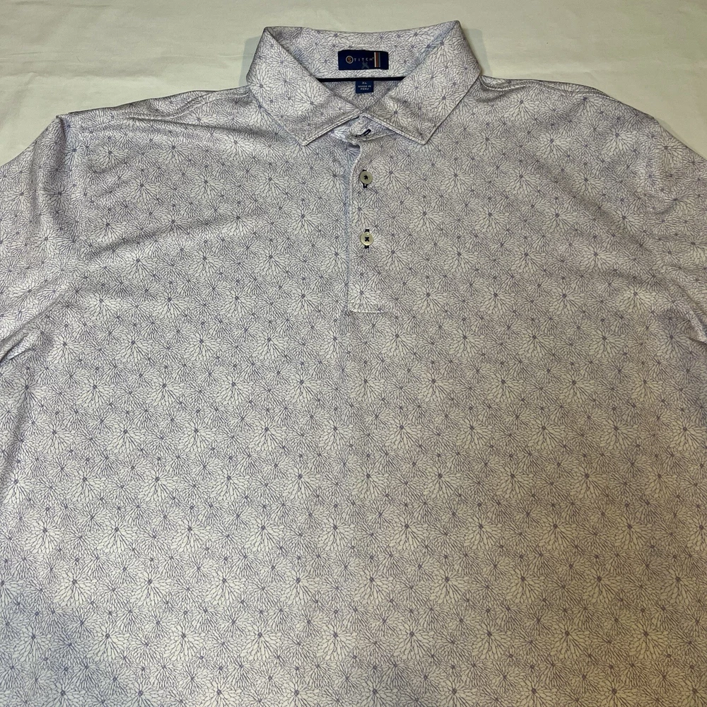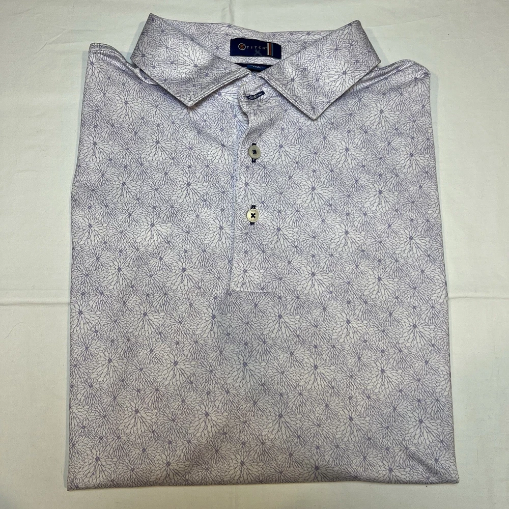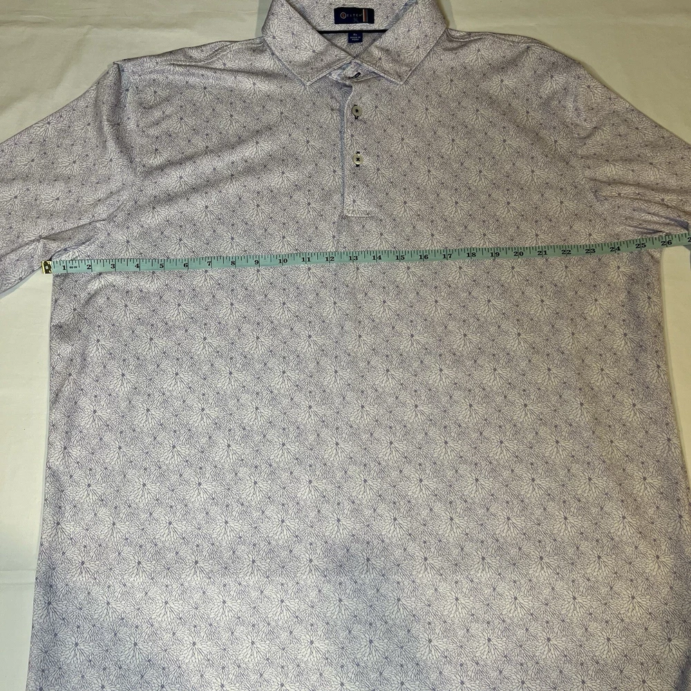 This is a men's Stitch brand golf polo shirt in size Large with a multicolor floral print design. It features short sleeves, a collared neckline, and is made for a regular fit. The shirt is breathable and is suitable for golfing activities. It does not have a vintage style. CONDITION: this is a pre-owned item in excellent condition with no known damage or stains.