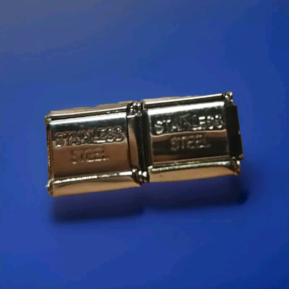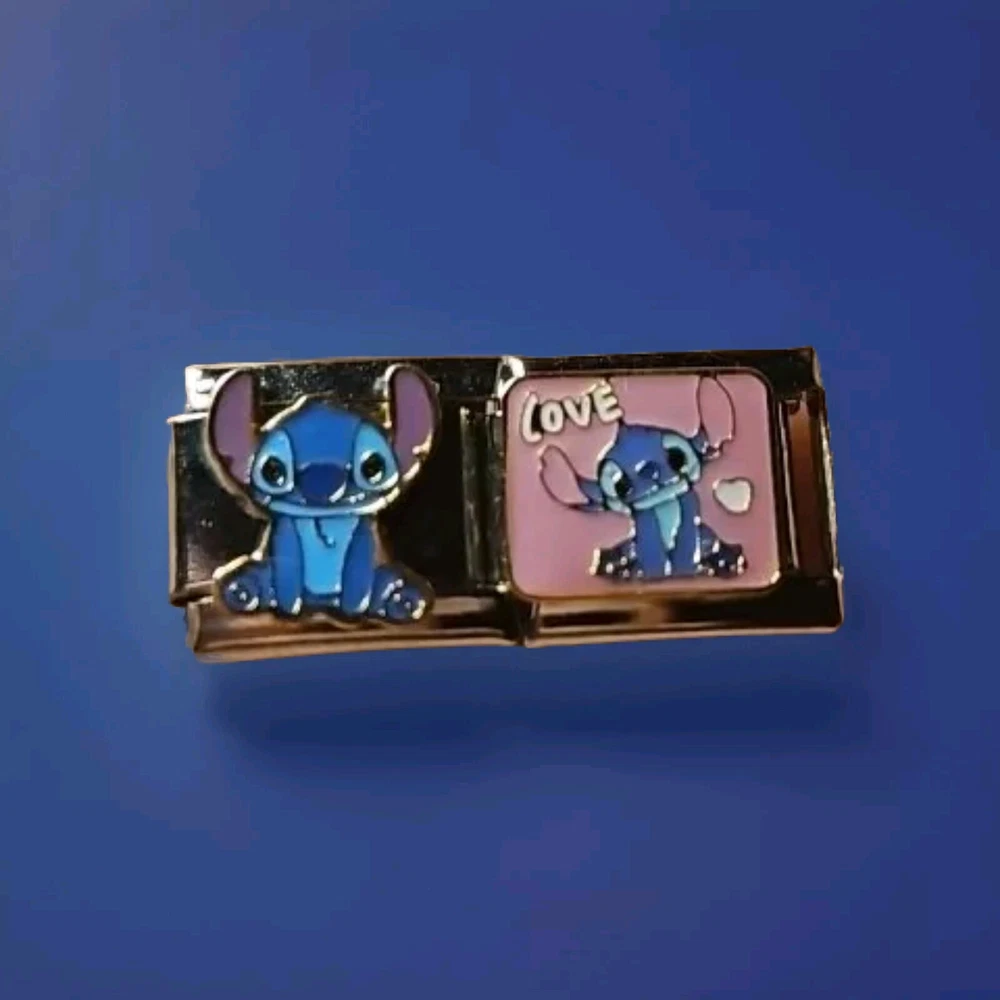 Lilo alien Stitch love Italian Charms. Set of two. Crafted from stainless steel, these charms are perfect for any occasion, whether it be a gift for a loved one or a special treat for yourself. The charms feature a rectangular shape with a link closure, making them easy to add to your bracelet. The charms are customizable and can be personalized with your own unique design. They come in a 9mm length and are available in silver color. These charming Italian charms are a great addition to any collection and make a wonderful gift for any animal lover.