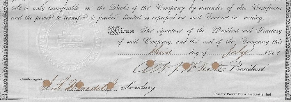 Lafayette & Indianapolis Railroad Company Ran between the two names cities Special Certificate of Stock Printed 20 Shares Capital Stock Certificate for 20 shares, #23 , Dated 1851 In Black on blue/gray paper President is Albert Smith White. Appointed by A. Lincoln to be a US District Court Judge in Indiana Biography included ** NOTEWORTHY ** Stock is glued to a piece of brown paper. Could beremoved PRINTER: Rossers' Power . Lafayette, Ind. Shown image copies are included with certificate Images: POSTAGE U.S. Sent First Class with tracking, starting @ $6.00 US Canada Sent First Class Canada with no tracking, starting @ $6.00 US NON U.S, case by case, starting @ $8.00 US, sent First Class. I do ship world wide. -- All the certificates and all other items I sell are sold as collectibles only; although they are authentic, they no longer hold financial value. I do have other items up for auction. I Do Combine