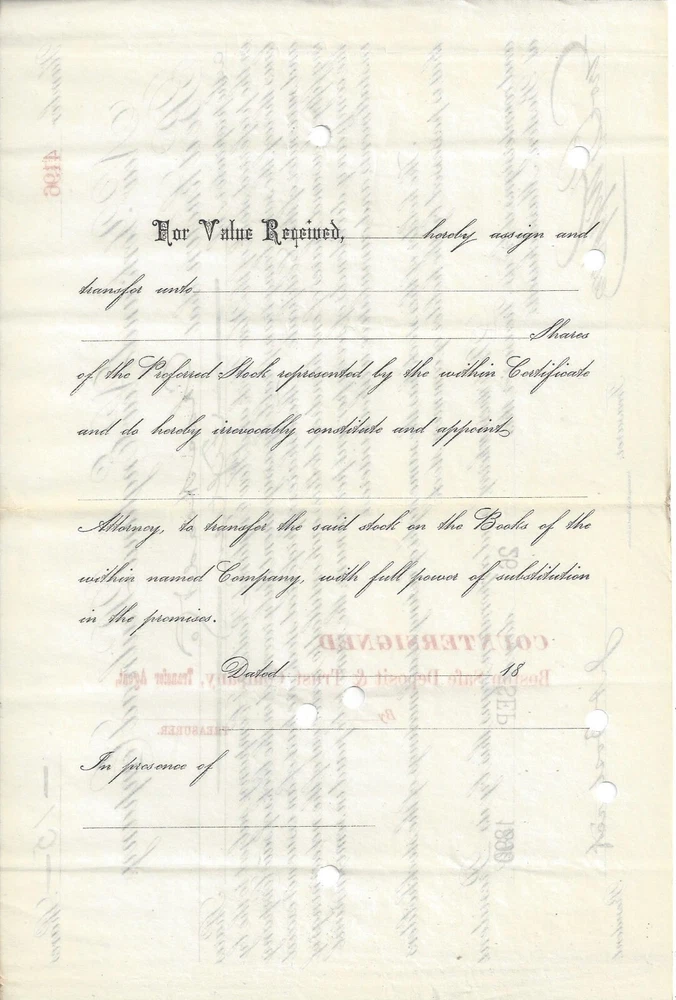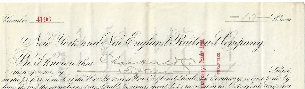 New York and New England Railroad Company Boston, Massachusetts PREFERRED Capital Stock Certificate for 15 shares, #4196 , Dated 1890 (188-) In BLACK ** NOTEWORTHY ** PRINTER: American Bank Note Co, Boston Information image copies are included with certificate Images: POSTAGE U.S. Sent First Class with tracking, starting @ $6.00 US Canada Sent First Class Canada with no tracking, starting @ $6.00 US NON U.S, case by case, starting @ $8.00 US, sent First Class. I do ship world wide. -- All the certificates and all other items I sell are sold as collectibles only; although they are authentic, they no longer hold financial value. I do have other items up for auction. I Do Combine